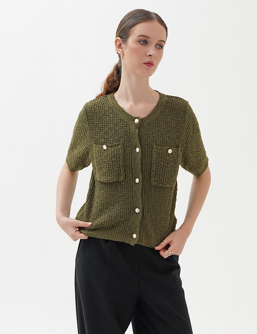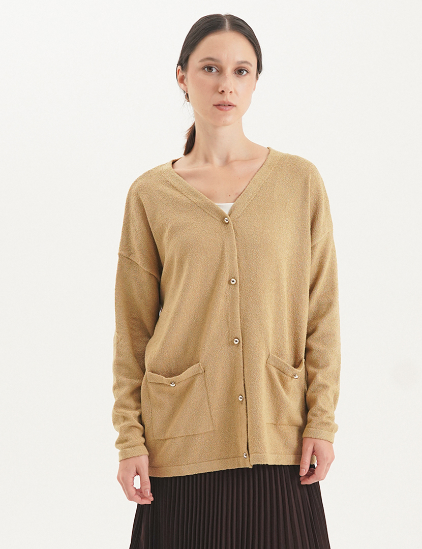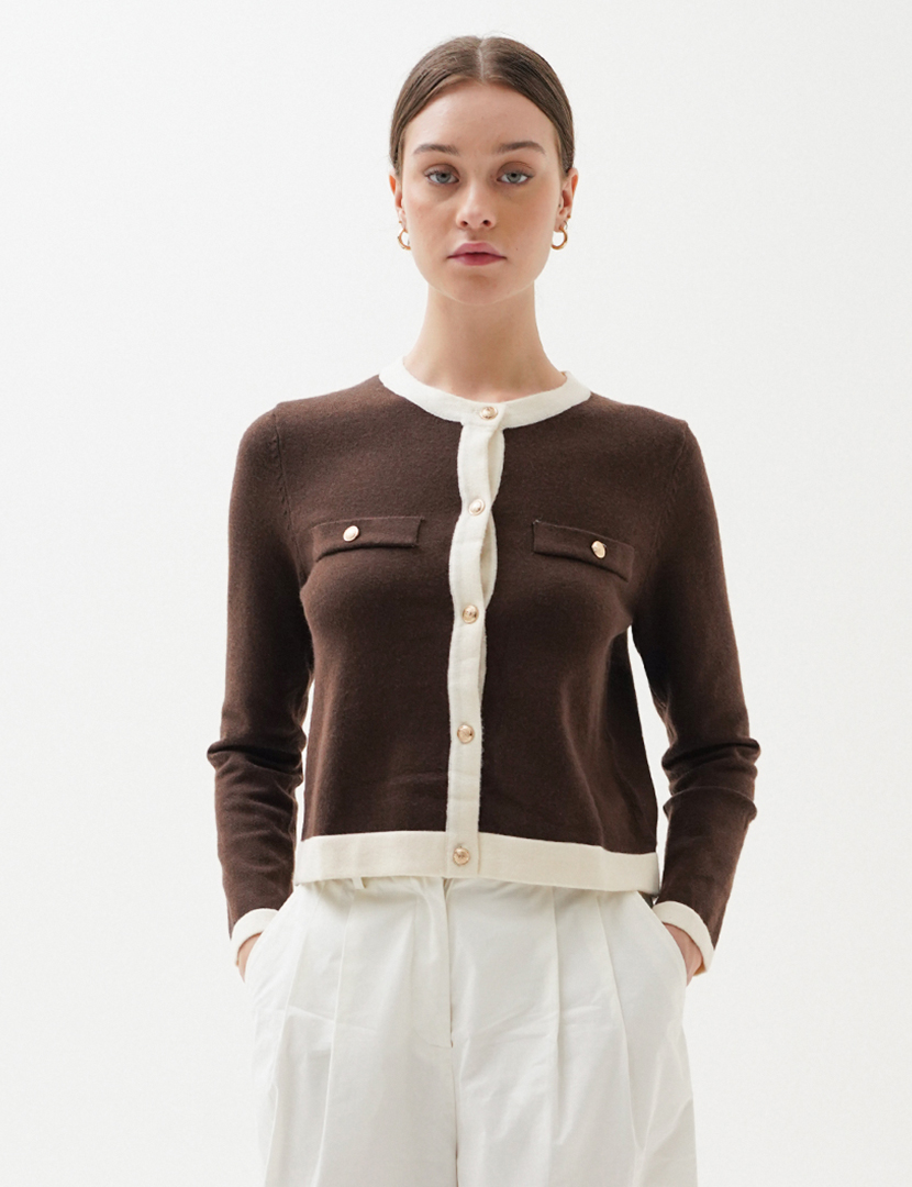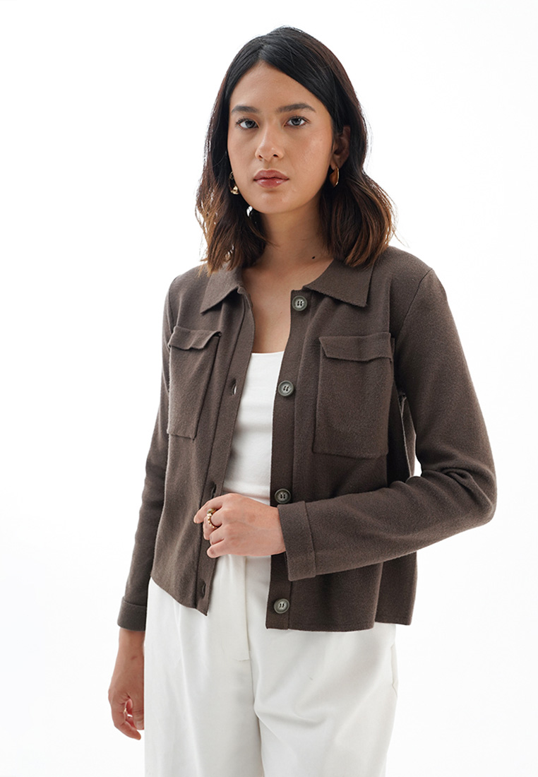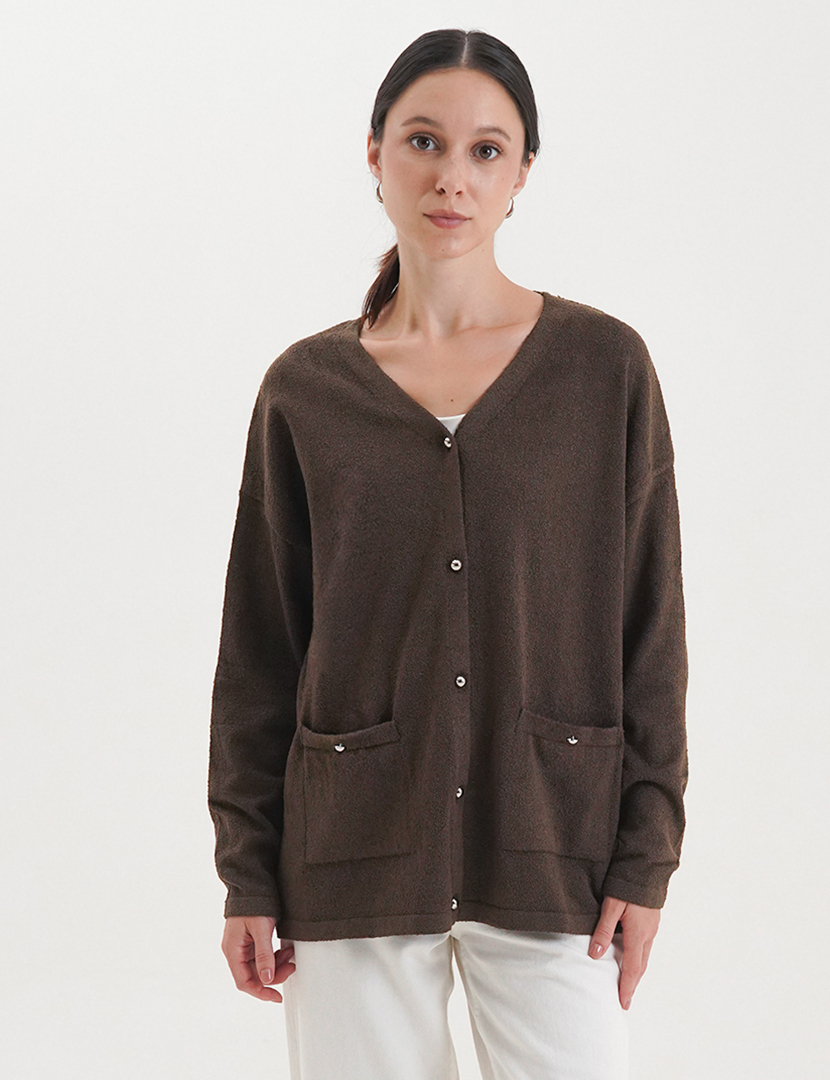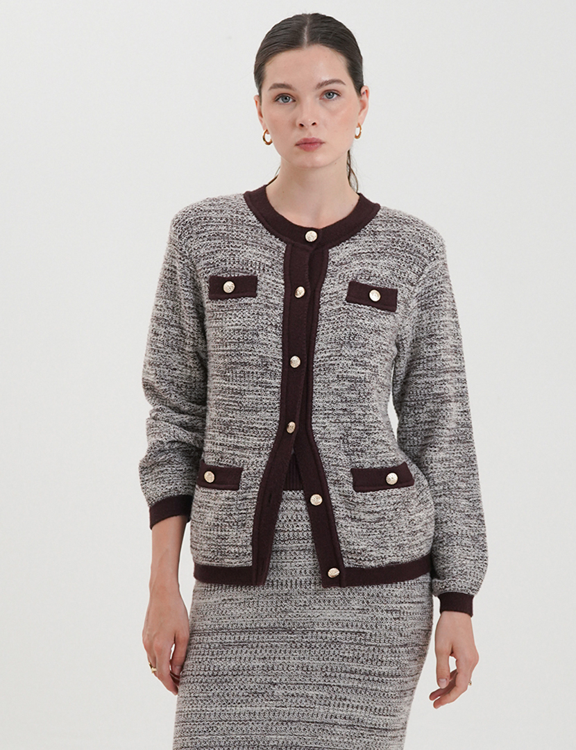 Fall Collection Tweed Pattern Double Pocket Cardigan Dark Brown