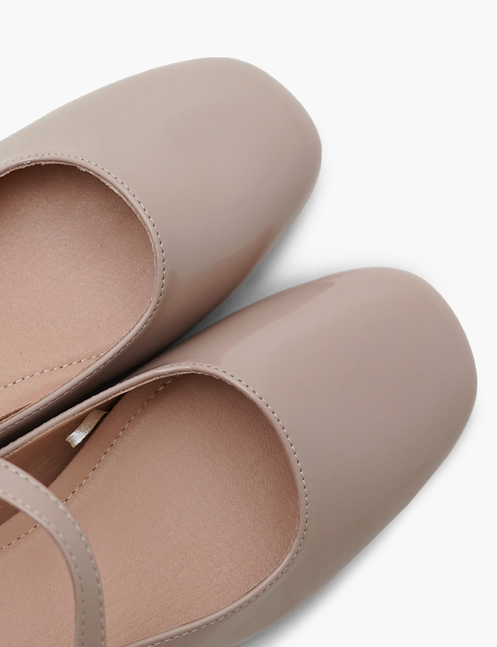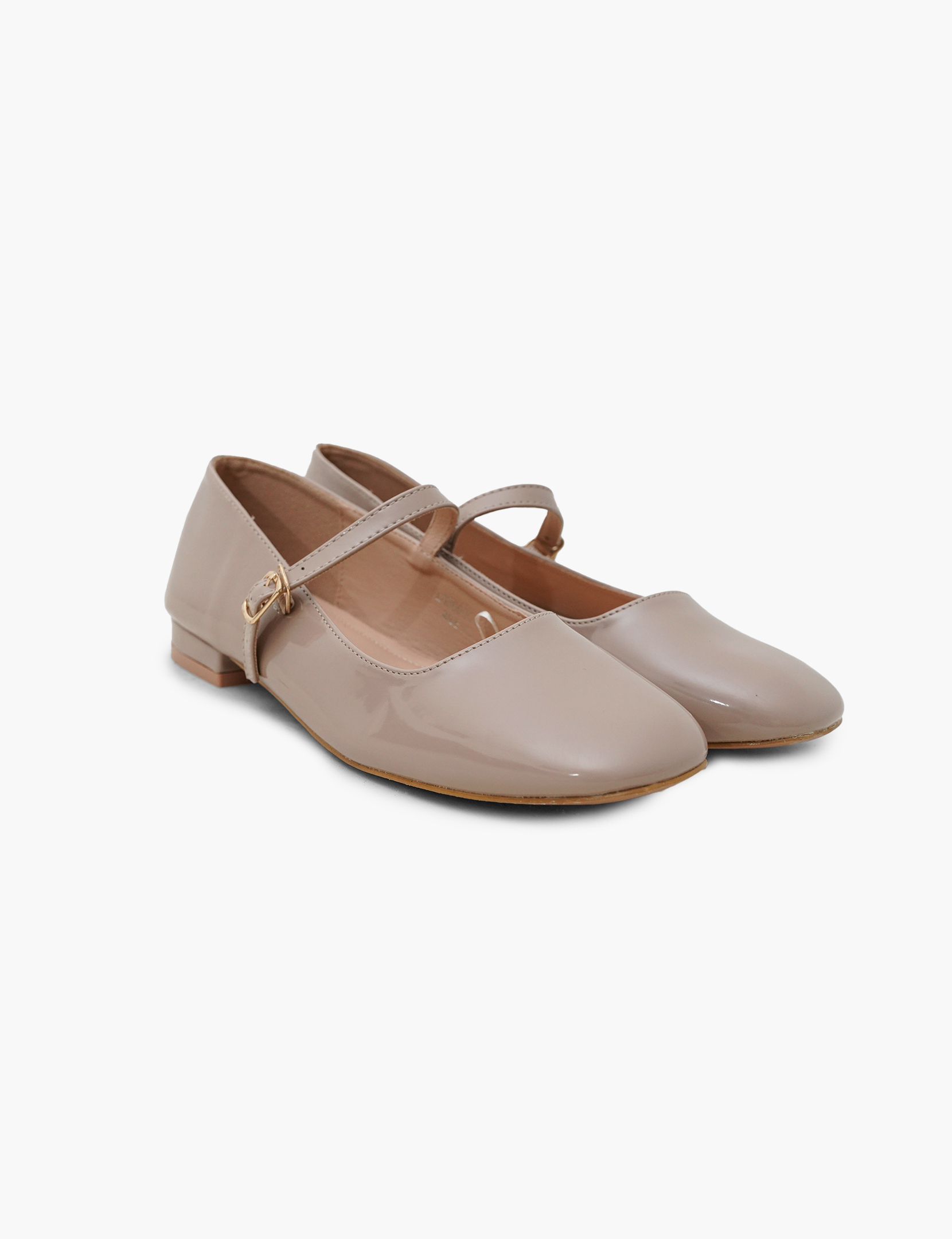 Mary jane style ballet flats with a faux patent finish, block heel, ankle strap fastening.