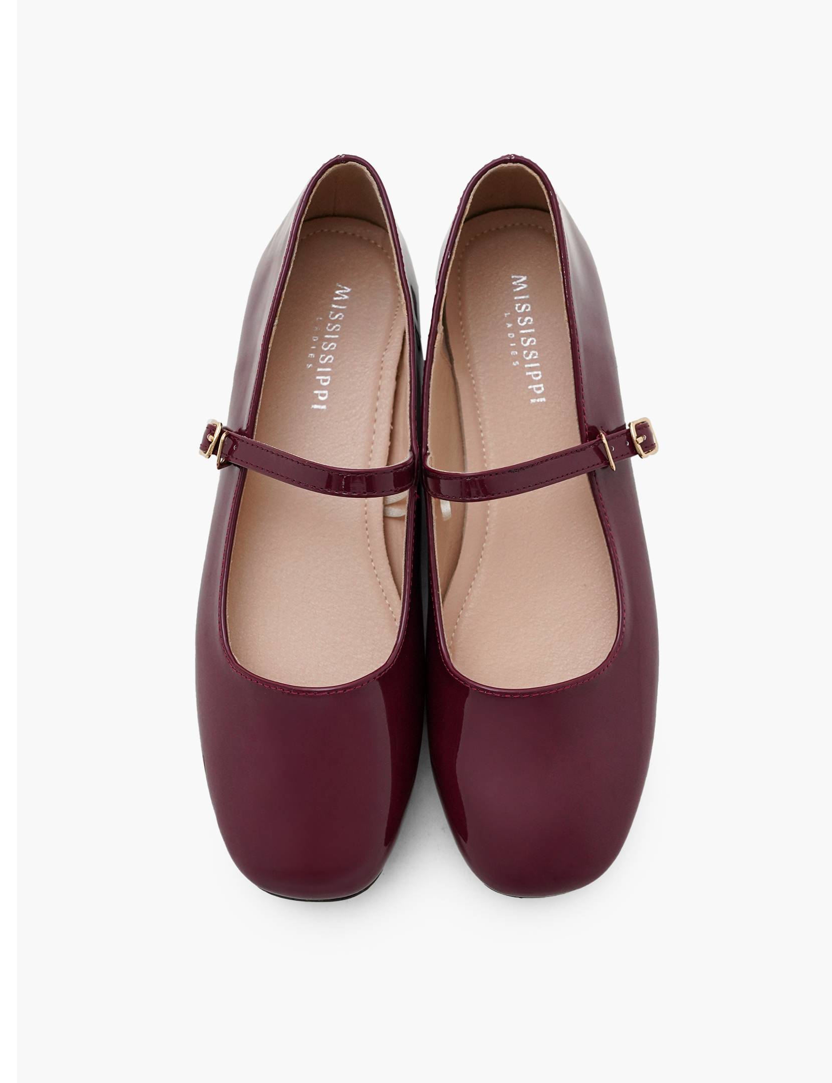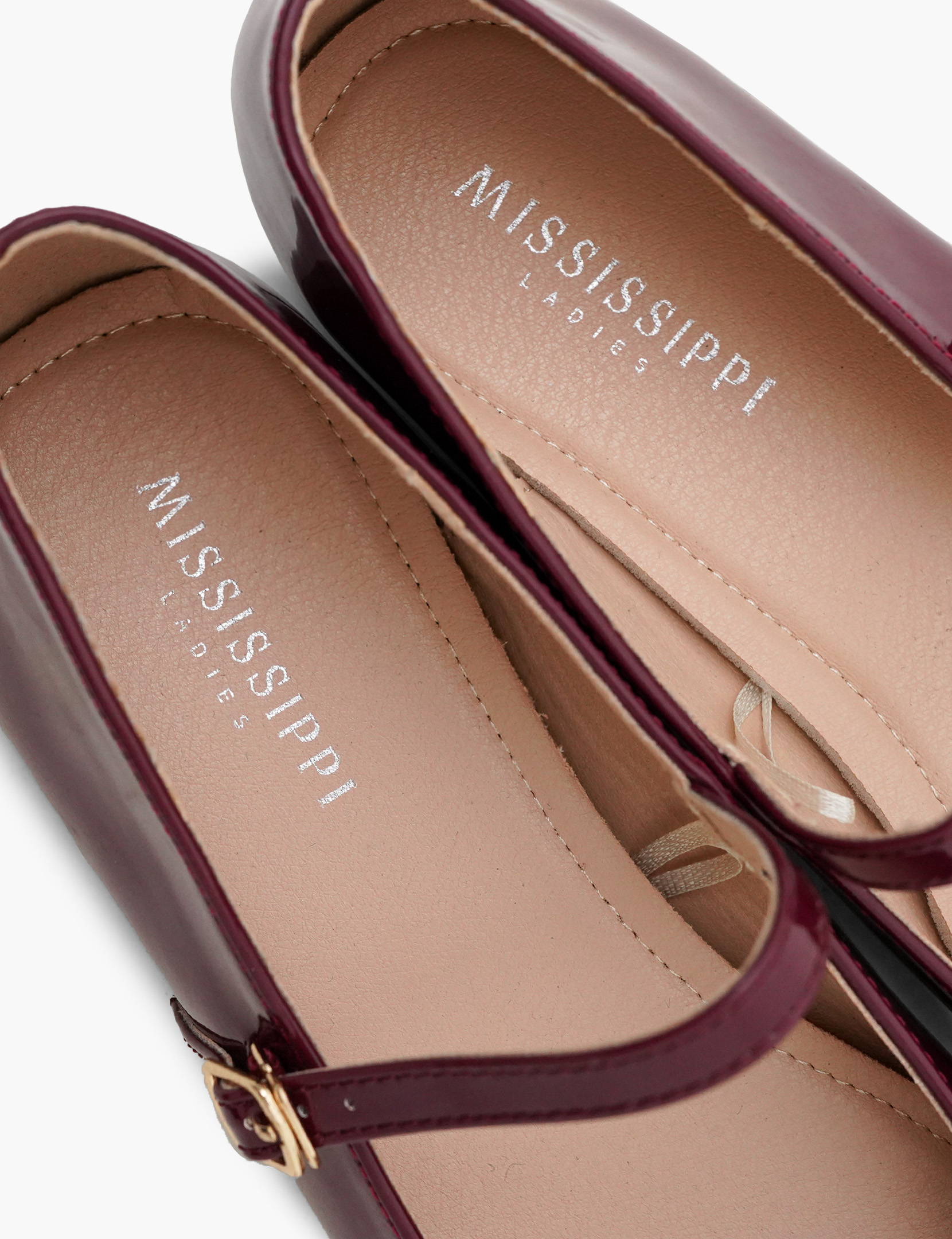 Mary jane style ballet flats with a faux patent finish, block heel, ankle strap fastening.