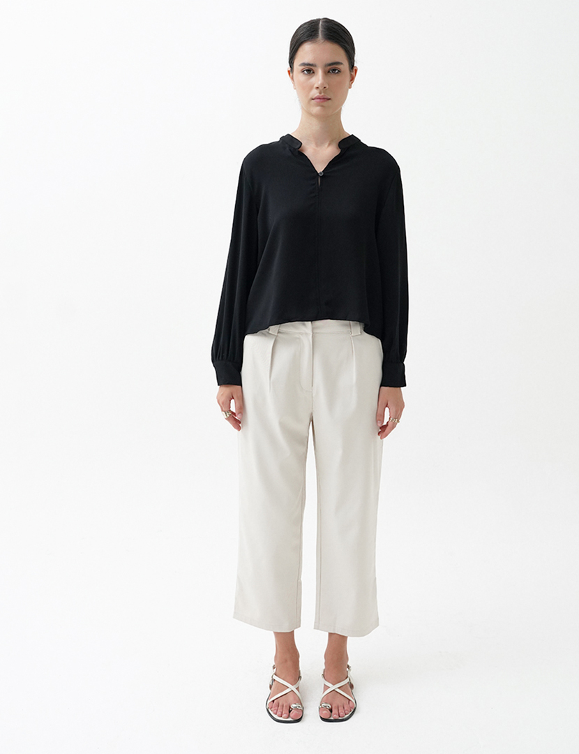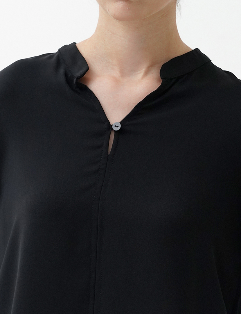Long sleeve top with a slot collar. Featuring matching button fastening on the front.