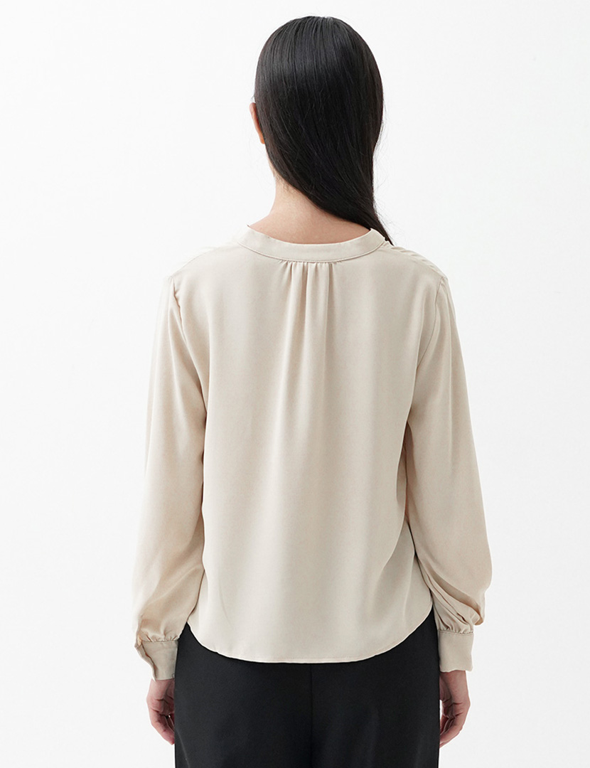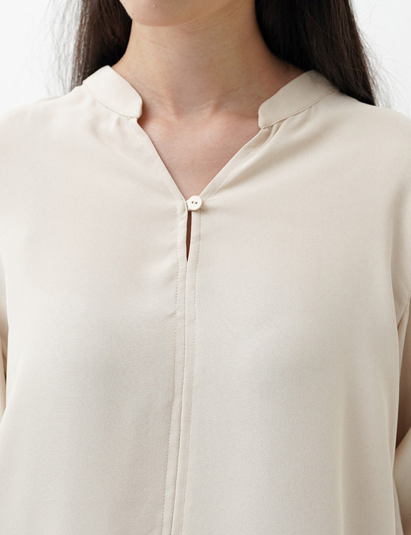 Long sleeve top with a slot collar. Featuring matching button fastening on the front.