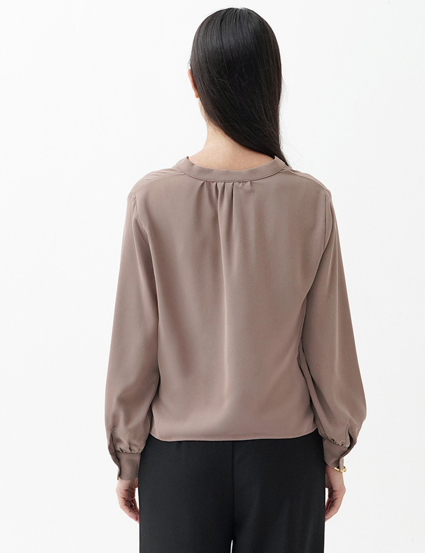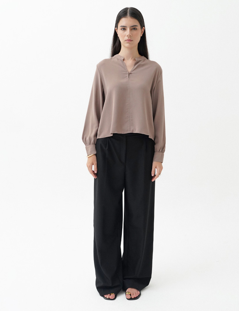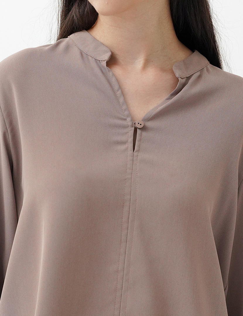 Long sleeve top with a slot collar. Featuring matching button fastening on the front.