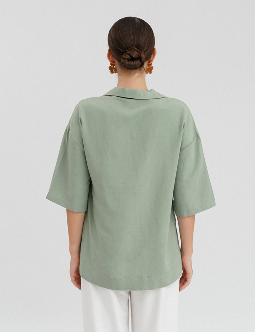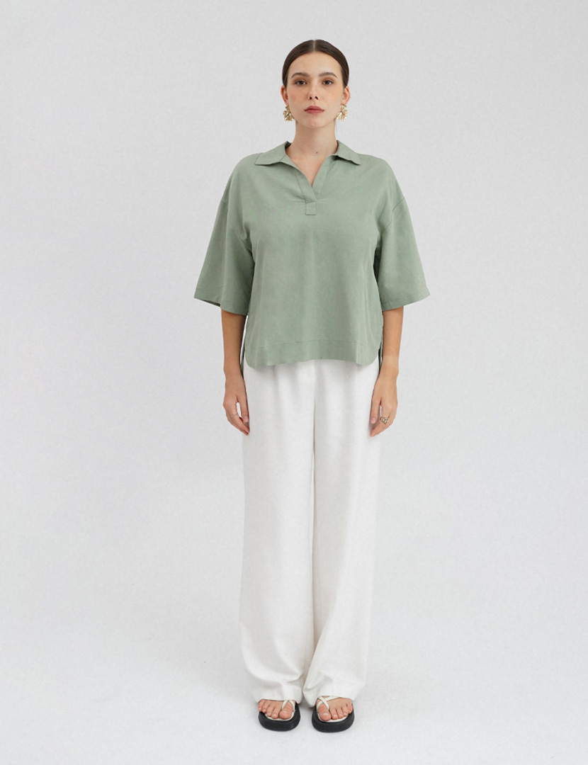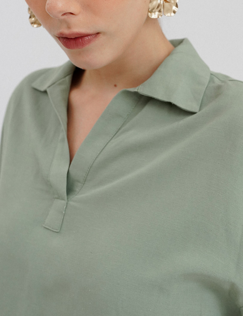 Loose fitting blouse with v-neckline. Featuring linen fabric and long sleeve.