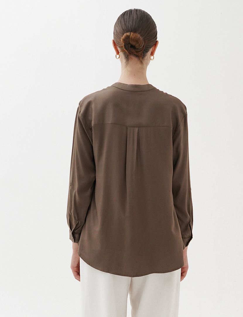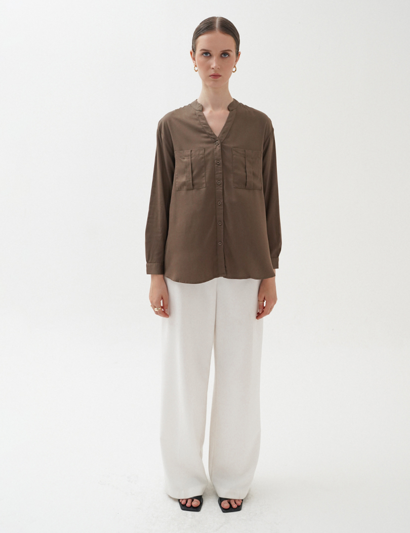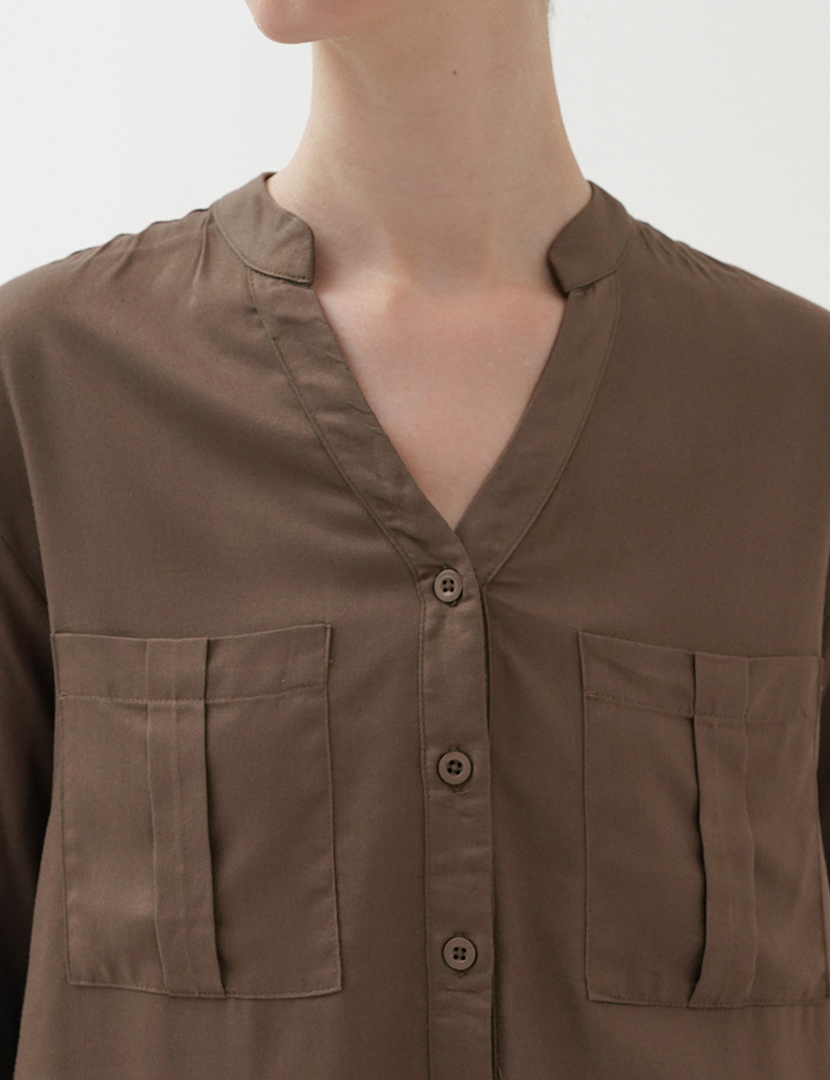 Round neck shirt with a v-neck, long sleeves, and featuring front patch pockets and a button-up front.