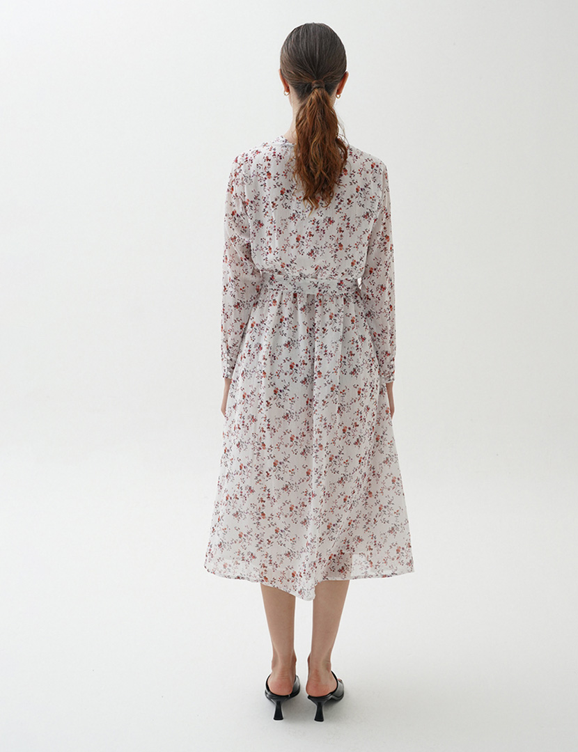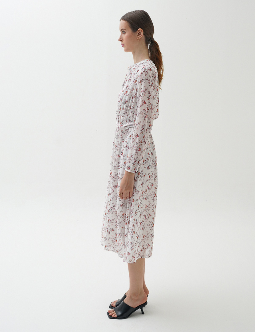 Midi dress with a slot collar and long sleeves, front ruffle trims and tie belt in the same fabric, elastic waist, lining, front fastening with buttons.