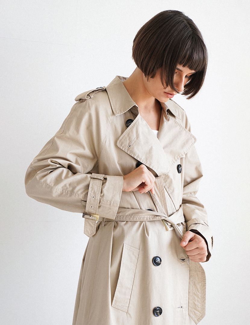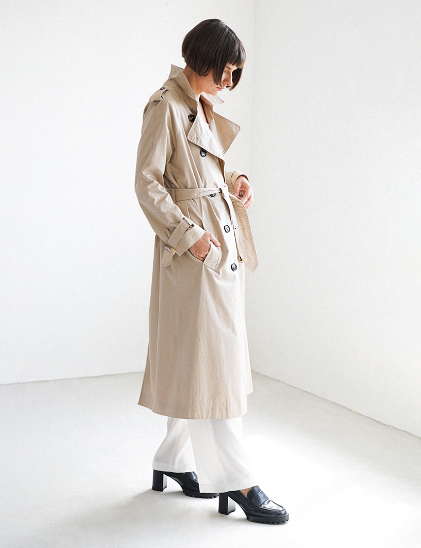 collared trench coat with long sleeves, tabs on the shoulders and cuffs, pockets with flaps, belt in the same fabric, double breasted button fastening.