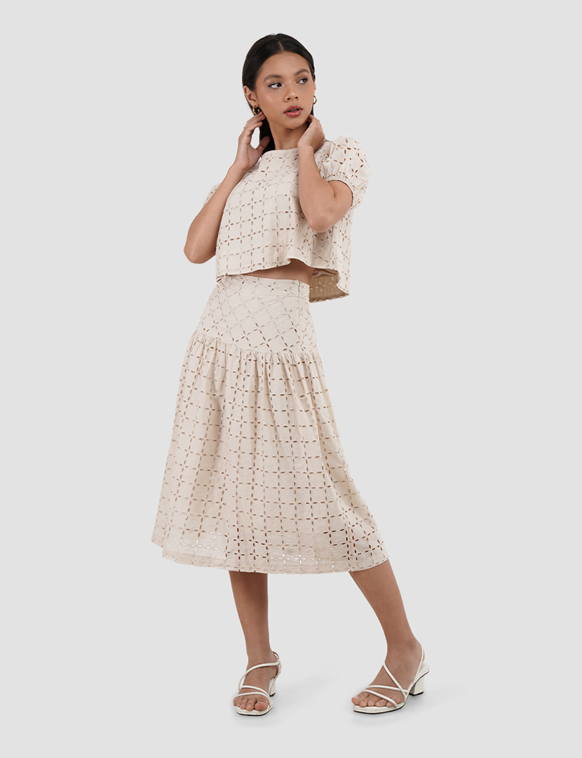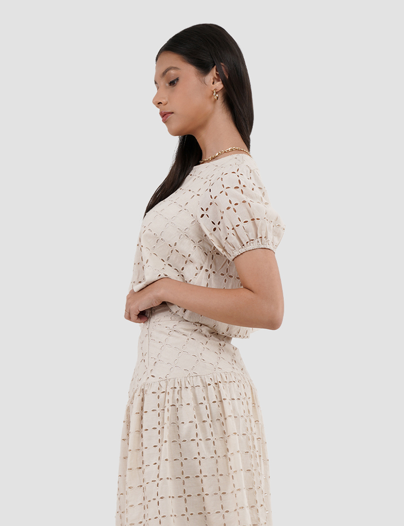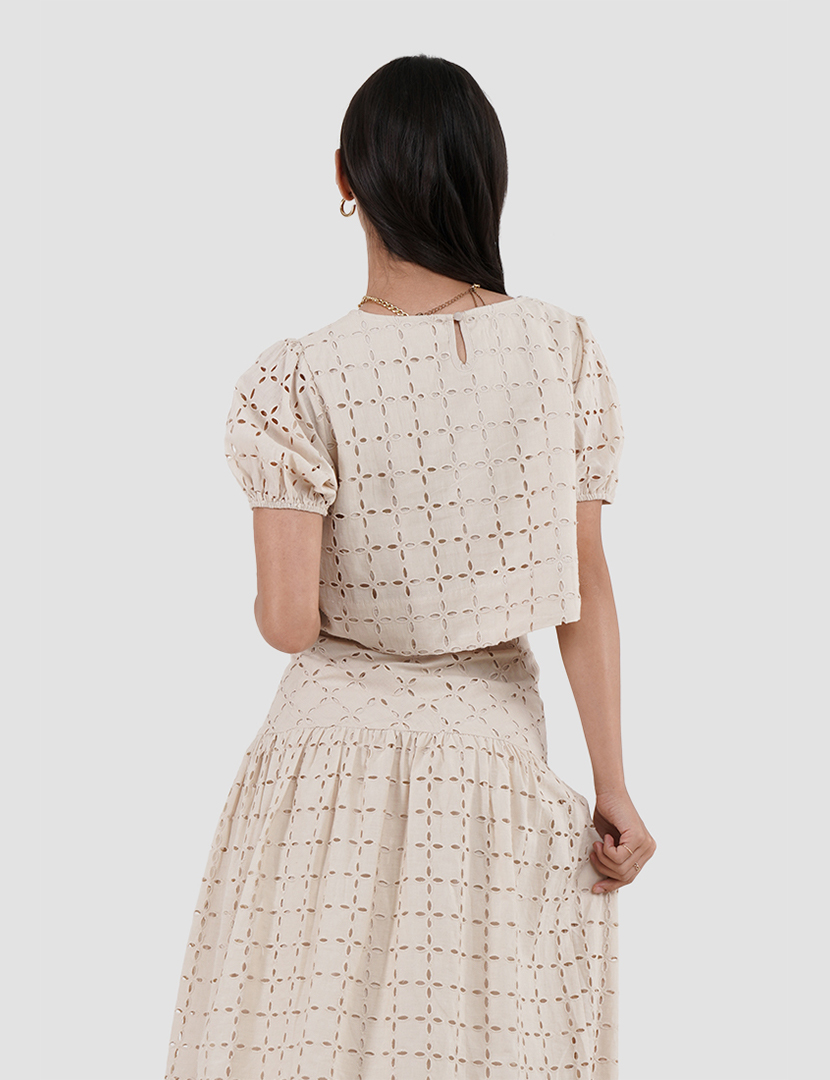 Blouse with a round collar and short puff sleeves. Featuring matching cutwork embroidery.