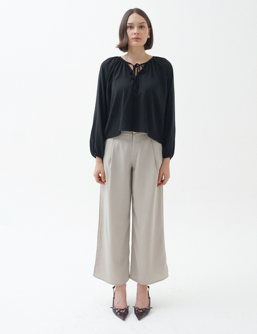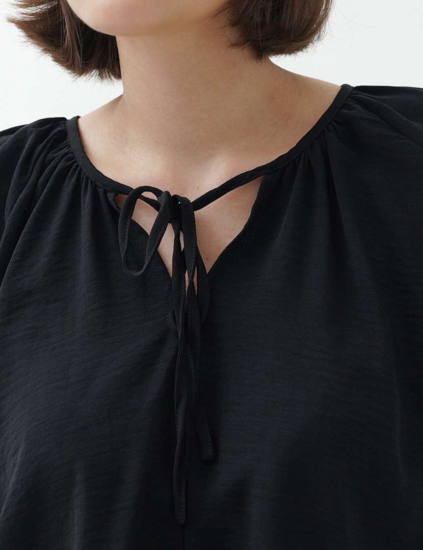 Loose-fit blouse with a v-shaped neckline and an opening with narrow ties. Long length balloon sleeves in a raglan cut with narrow elastic at the cuffs.