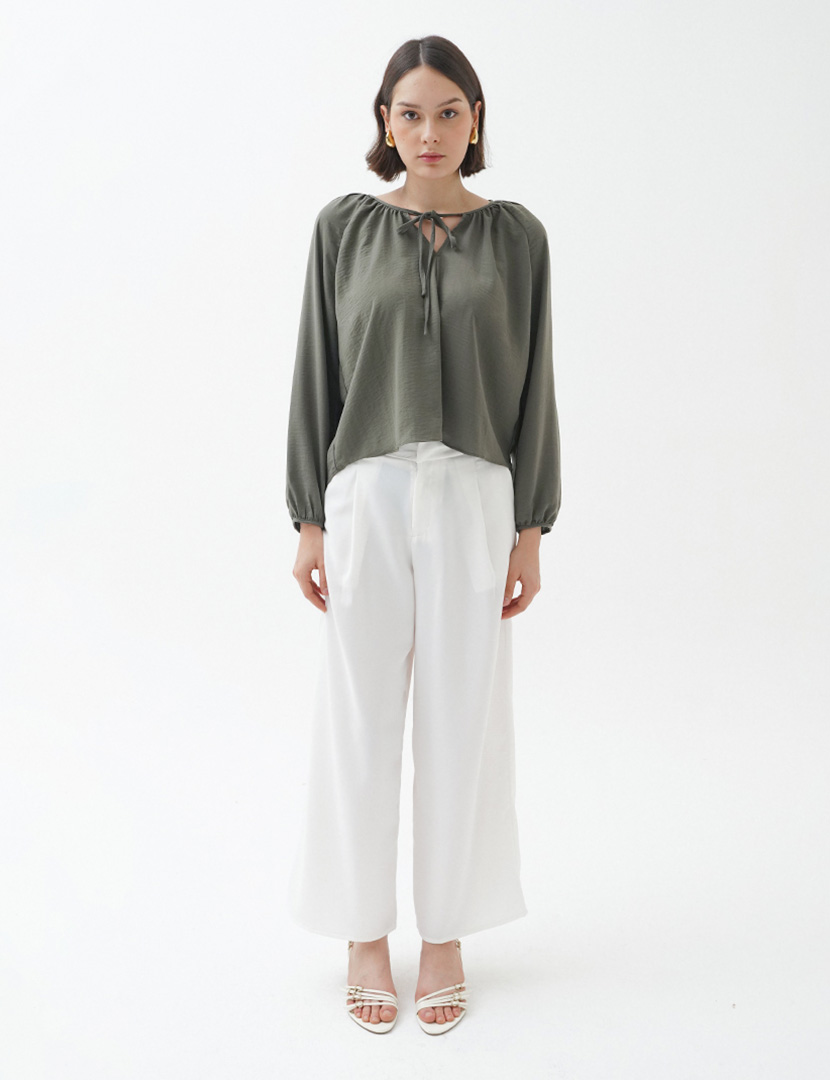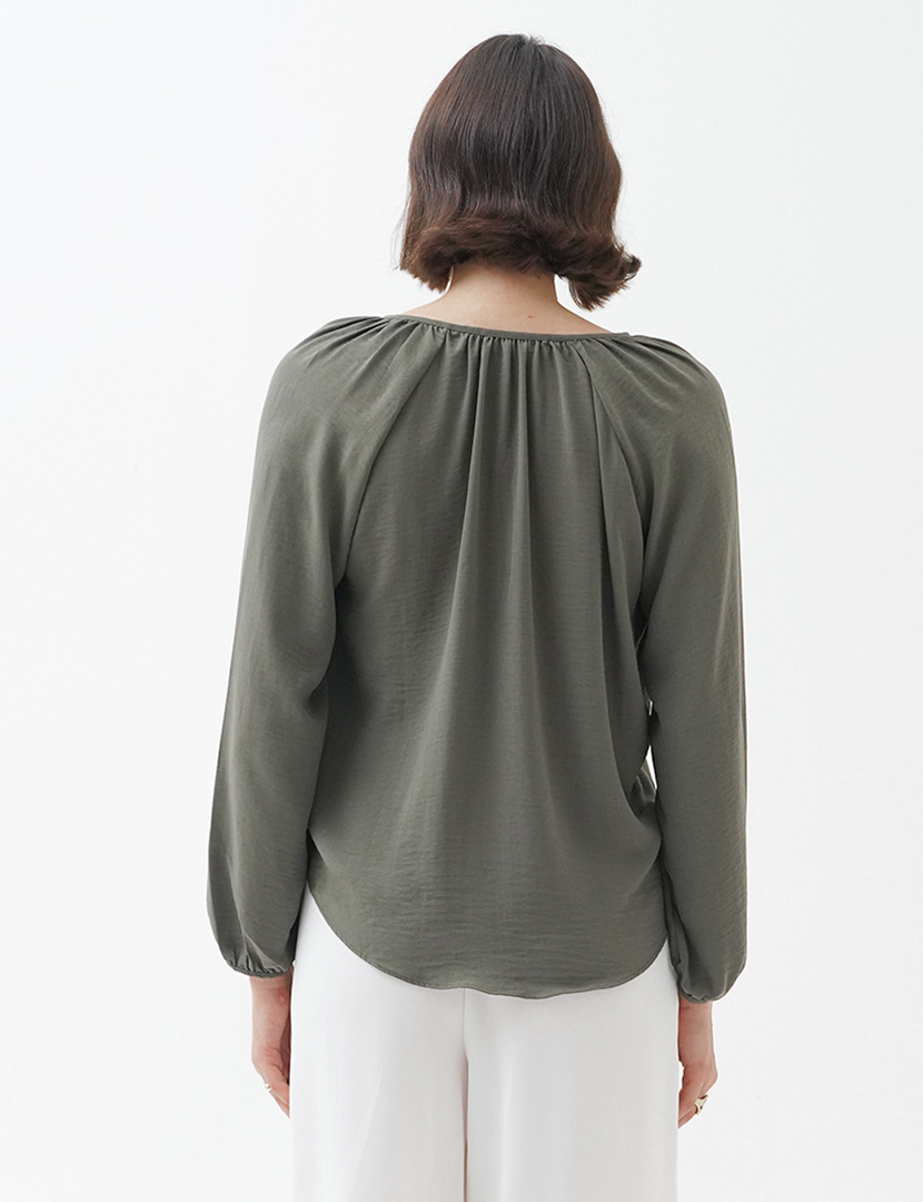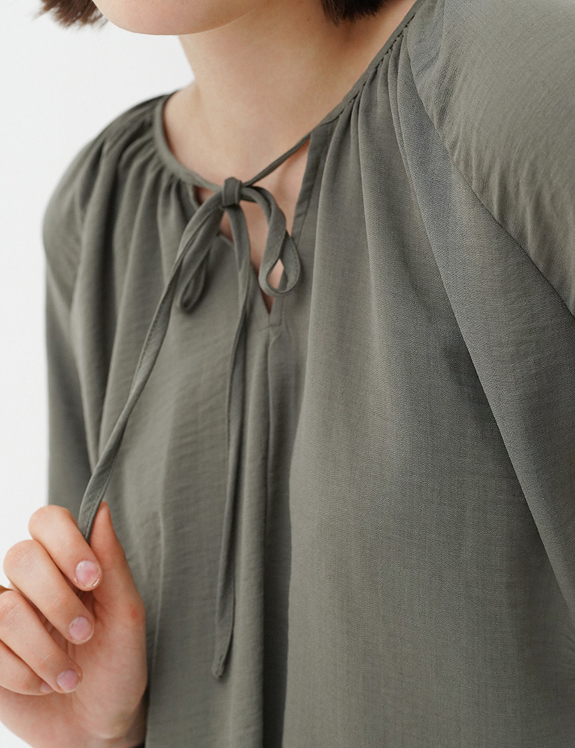 Loose-fit blouse with a v-shaped neckline and an opening with narrow ties. Long length balloon sleeves in a raglan cut with narrow elastic at the cuffs.