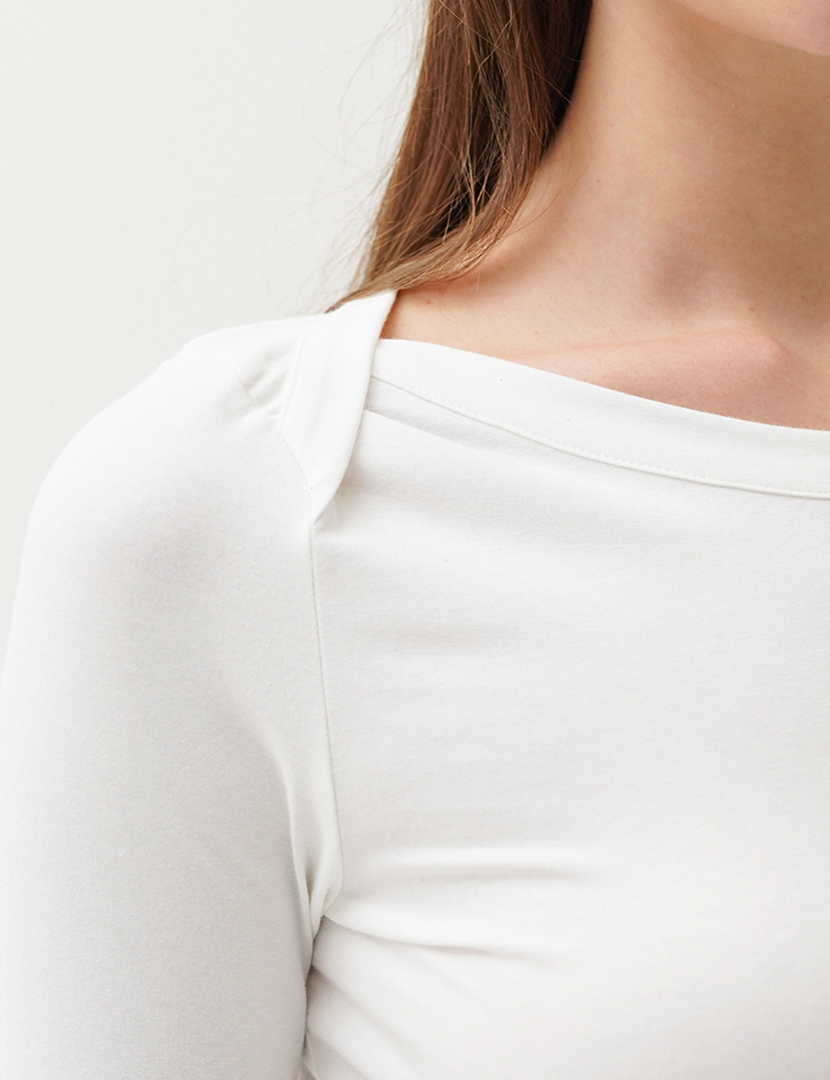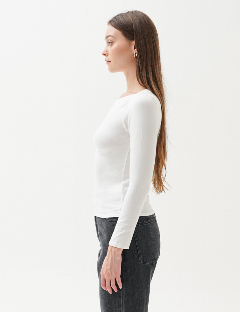 Cotton T-shirt. Features a boat neck and long sleeves.