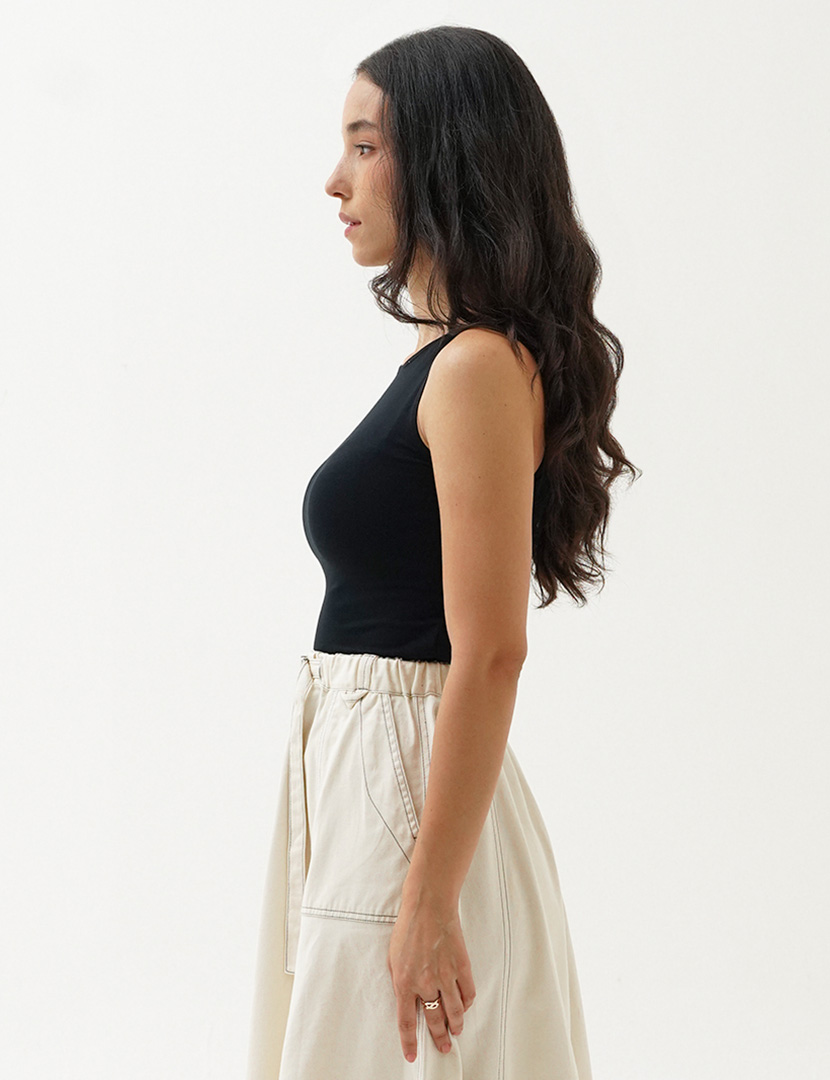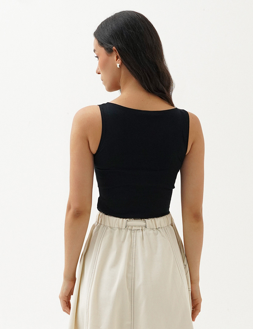 Sleeveless boat neck top made of a faded effect cotton blend.