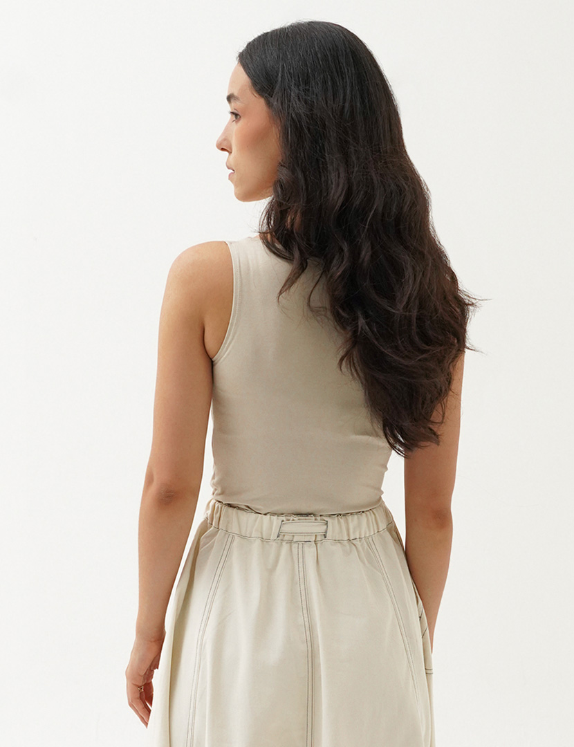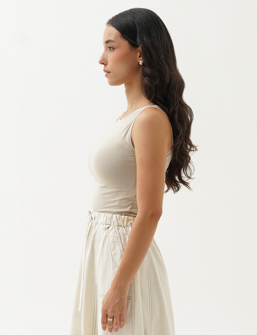 Sleeveless boat neck top made of a faded effect cotton blend.
