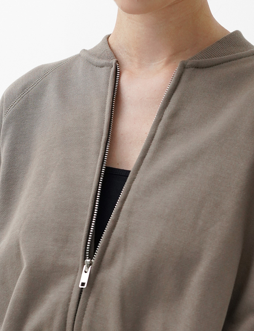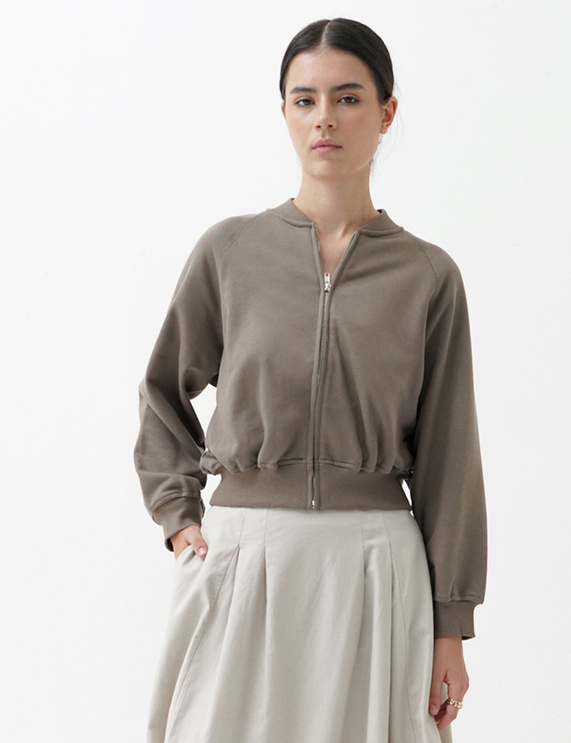 Bomber jacket with a zip fastening. Ribbed detail on the neck, sleeves, and hem.
