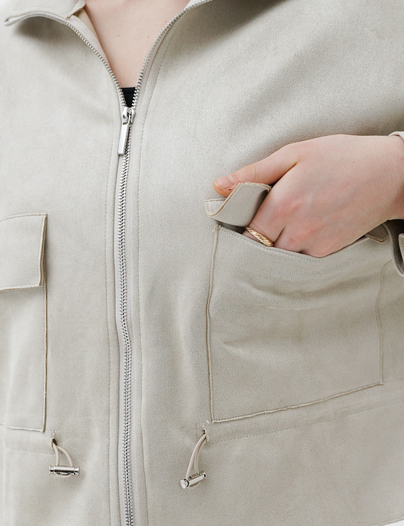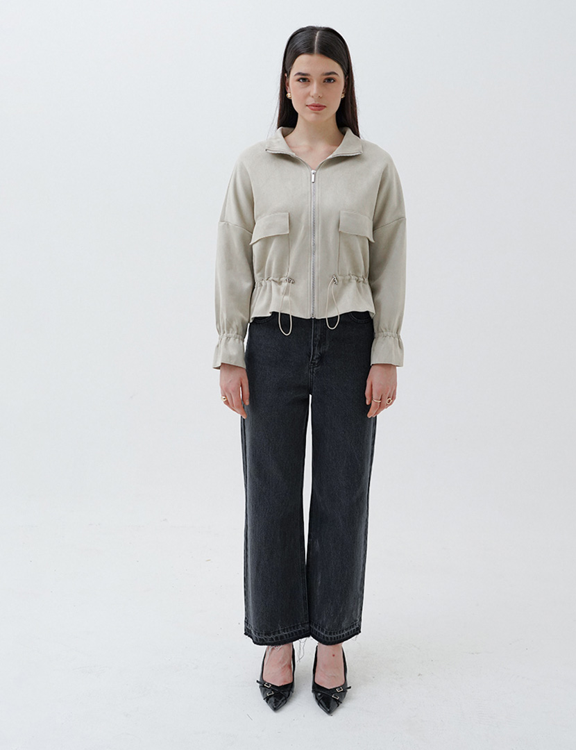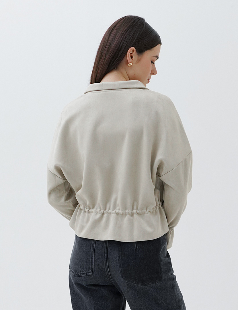 This bomber jacket with drawstring waist, drop shoulder, and rubber details on sleeve.