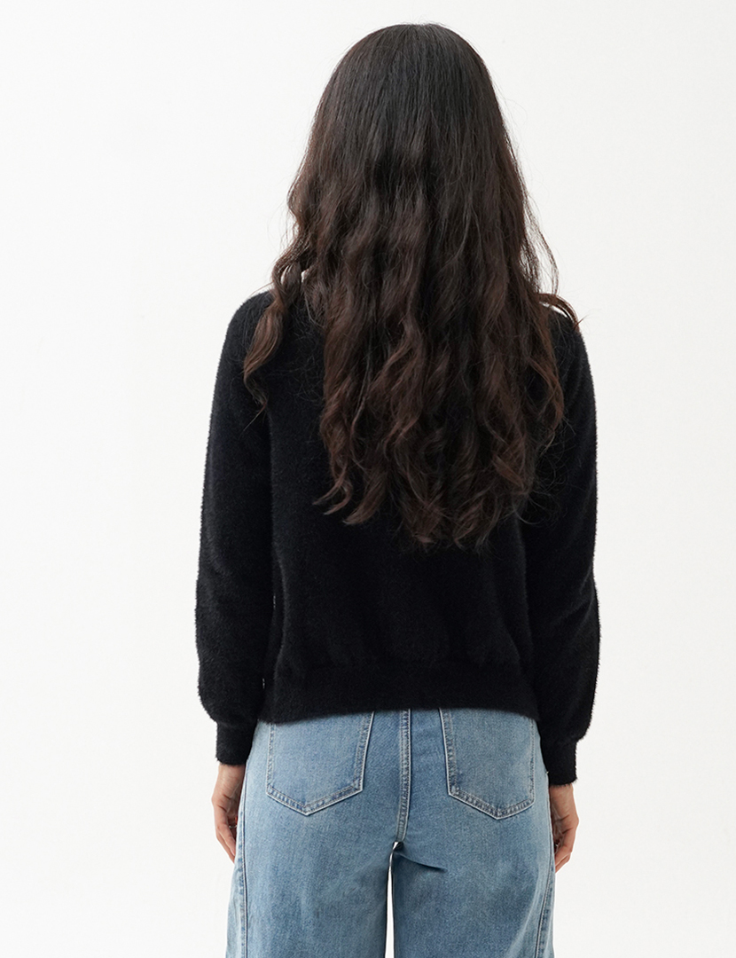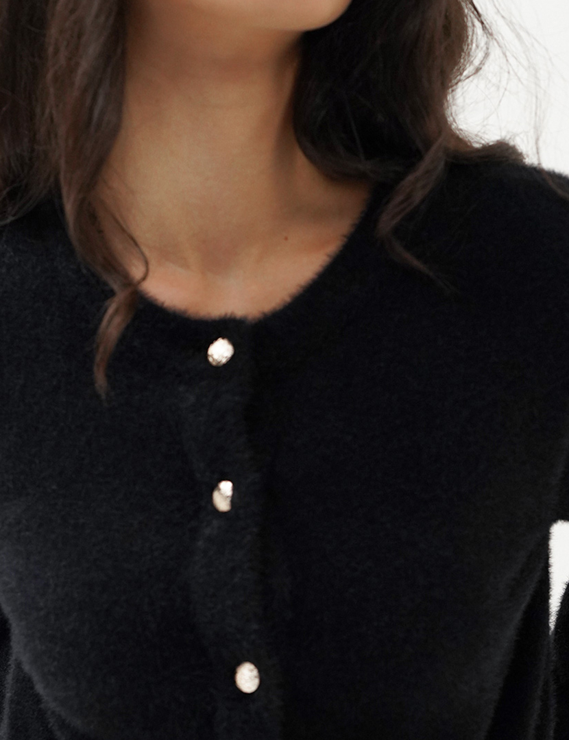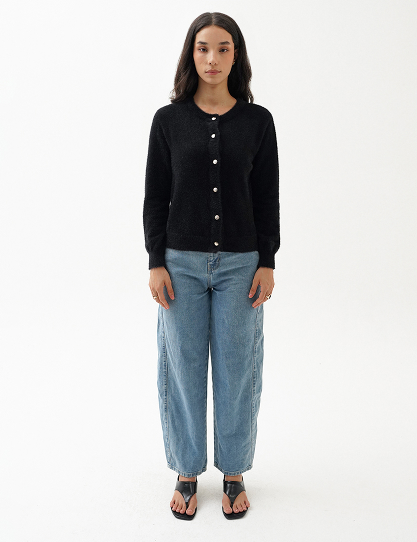 Cardigan in knitted fabric. Rounded neck and long sleeve details. Front button closure.