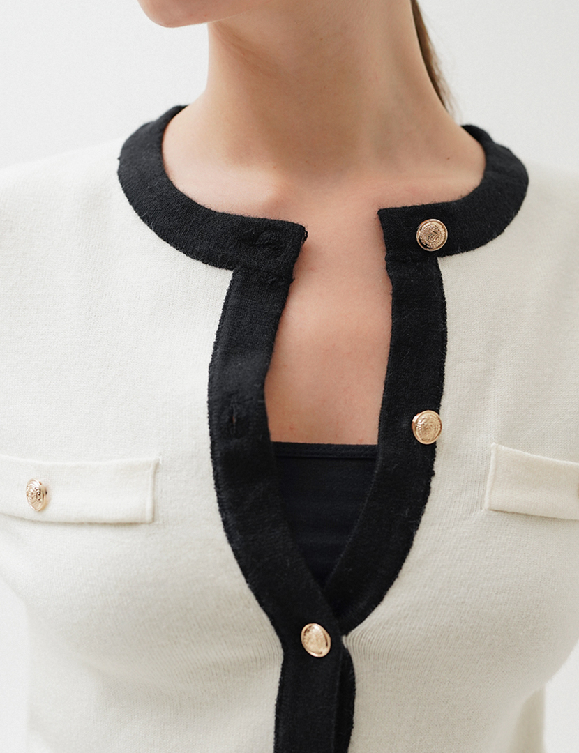 Round neck cardigan with long sleeves. Featuring front welt pockets and a front embossed gold button fastening.