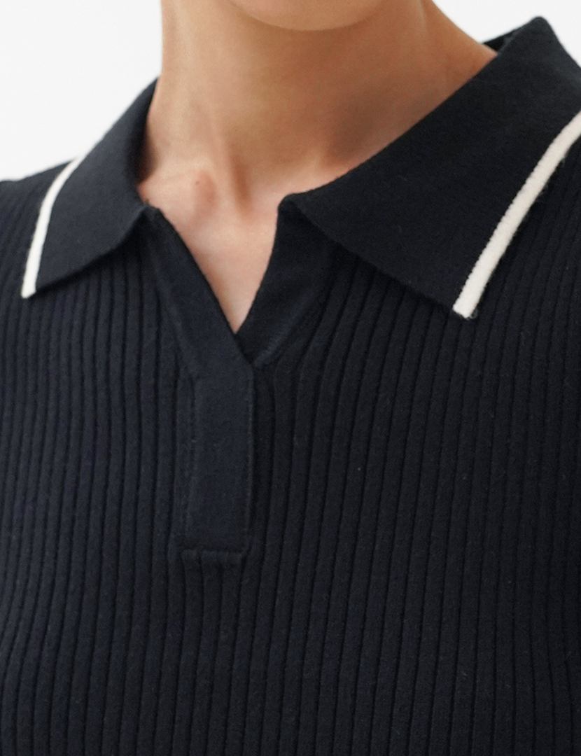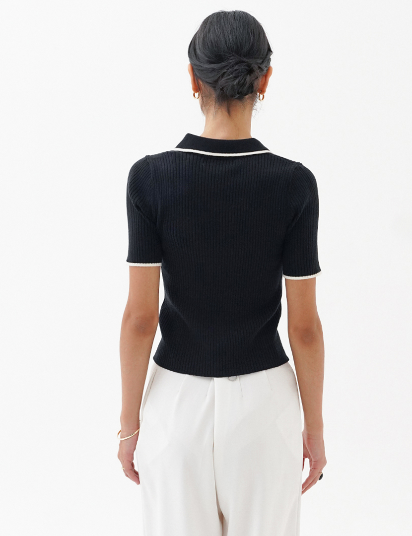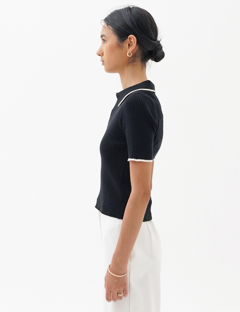 Knitted top with a polo collar inspired placket and contrast trimming.