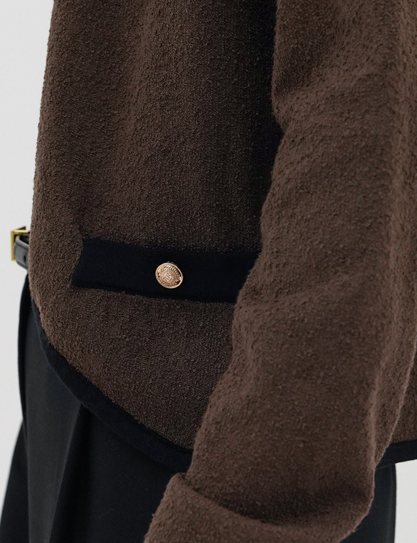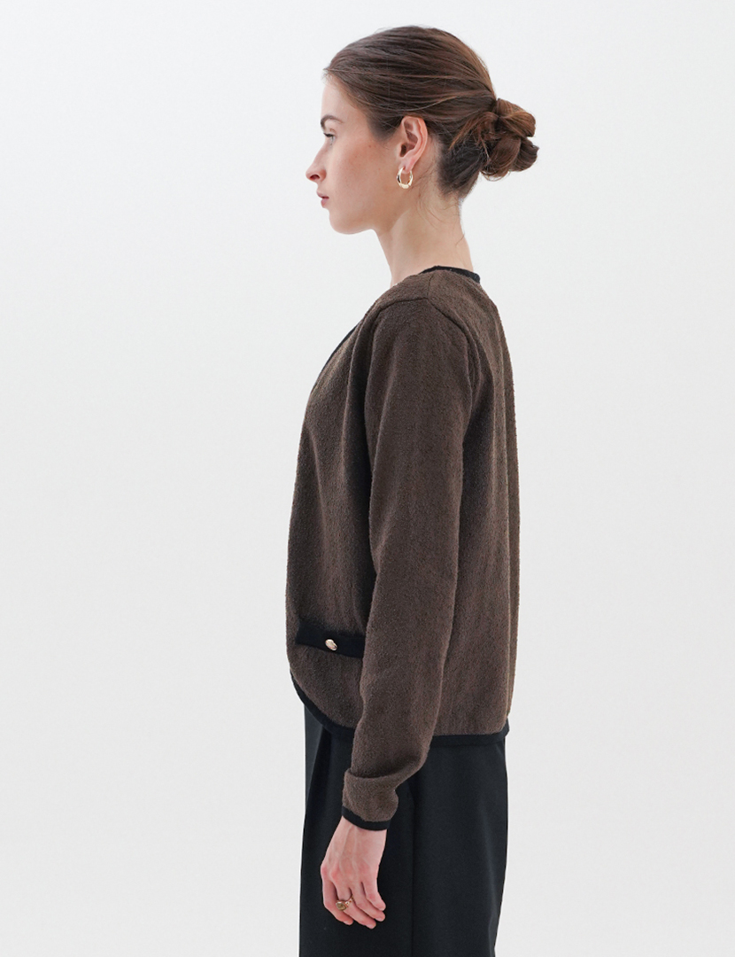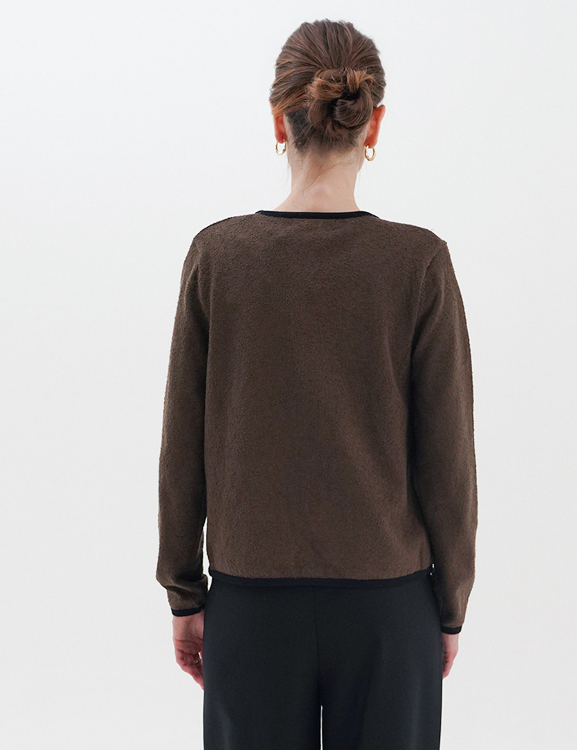 A textured knit cardigan with crew neckline, two welt pockets at the hips, and finished with contrast black trim.
