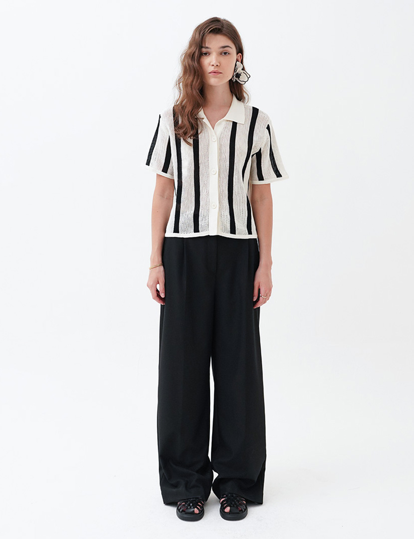Crochet shirt with short sleeves, a pointed collar, and three-button closure, straight silhouette.