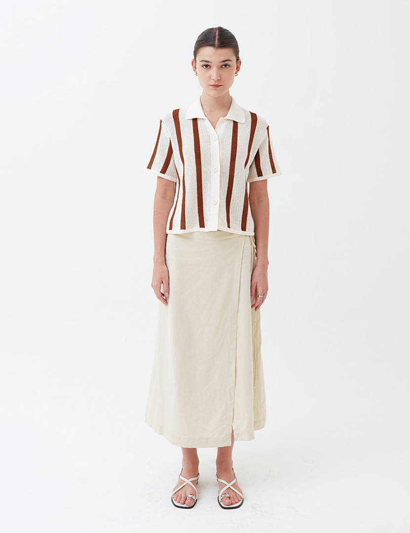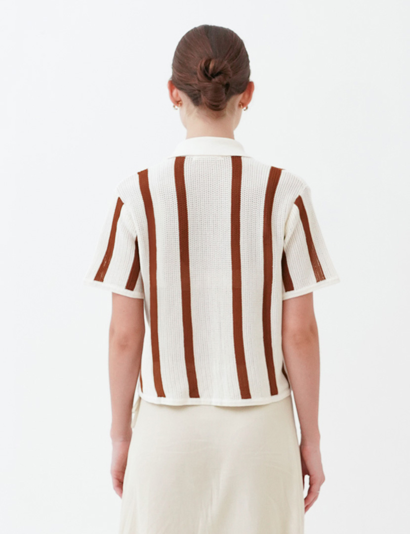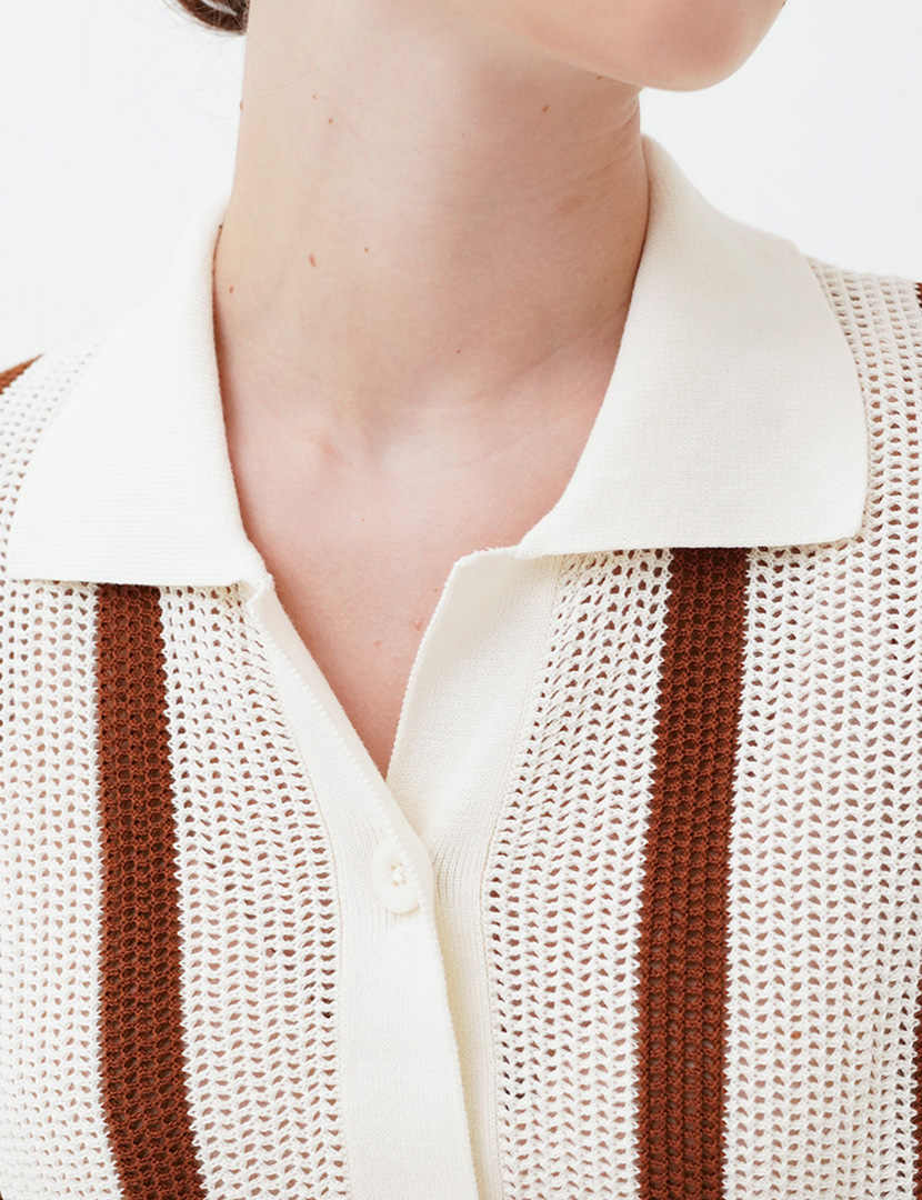 Crochet shirt with short sleeves, a pointed collar, and three-button closure, straight silhouette.