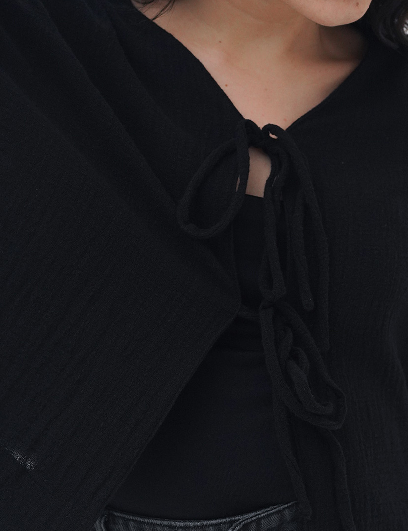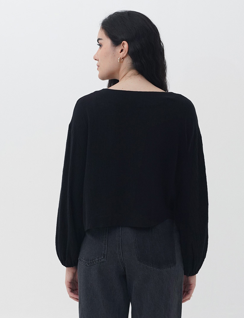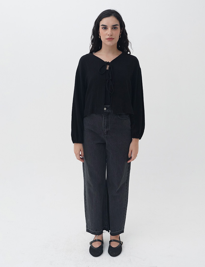 Blouse with two pairs of narrow ties, long and puff sleeves.