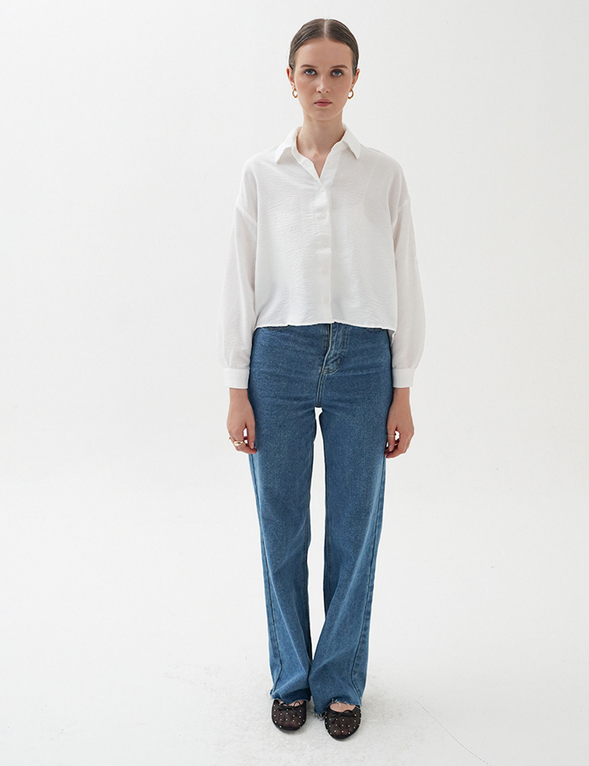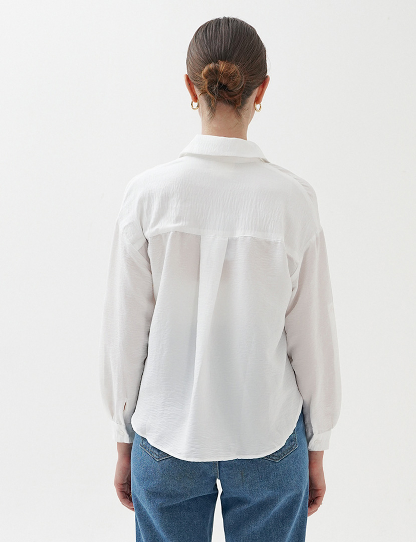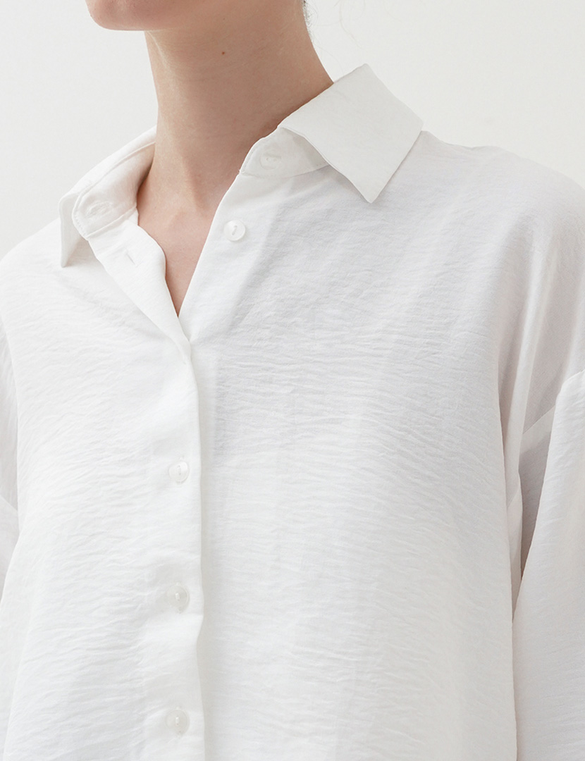 Crinkle shirt with a lapel collar, featuring long cuffed sleeves, and a button-up front.