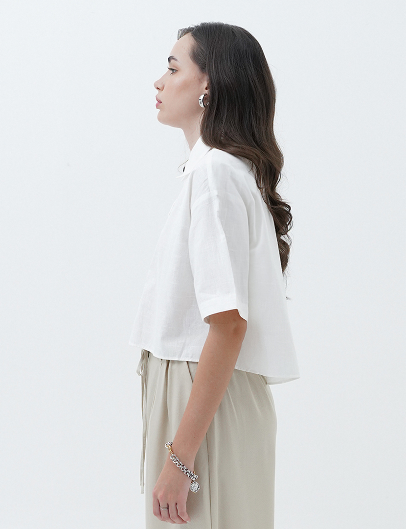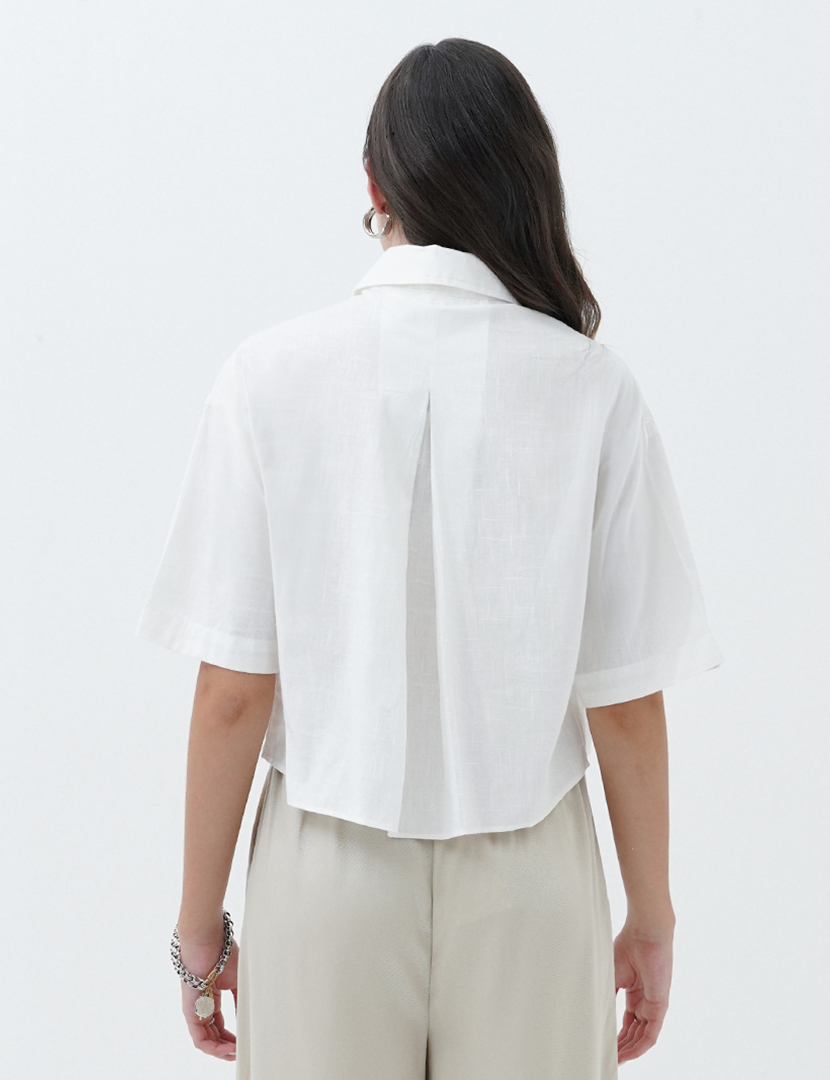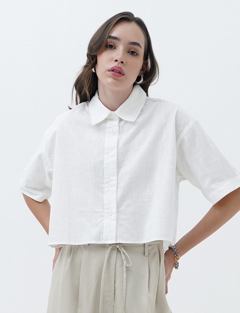 Crop top oversized shirt in linen with a collar, buttons down the front and an inverted box pleat at the back. Low dropped shoulders and wide, elbow-length sleeves.
