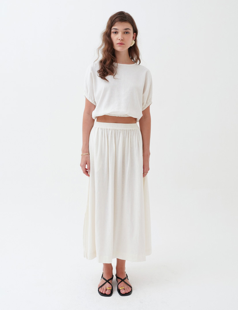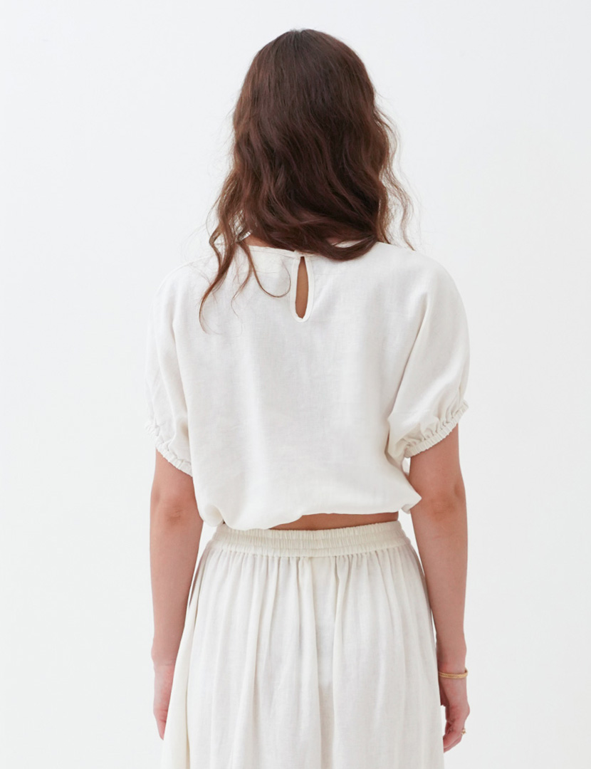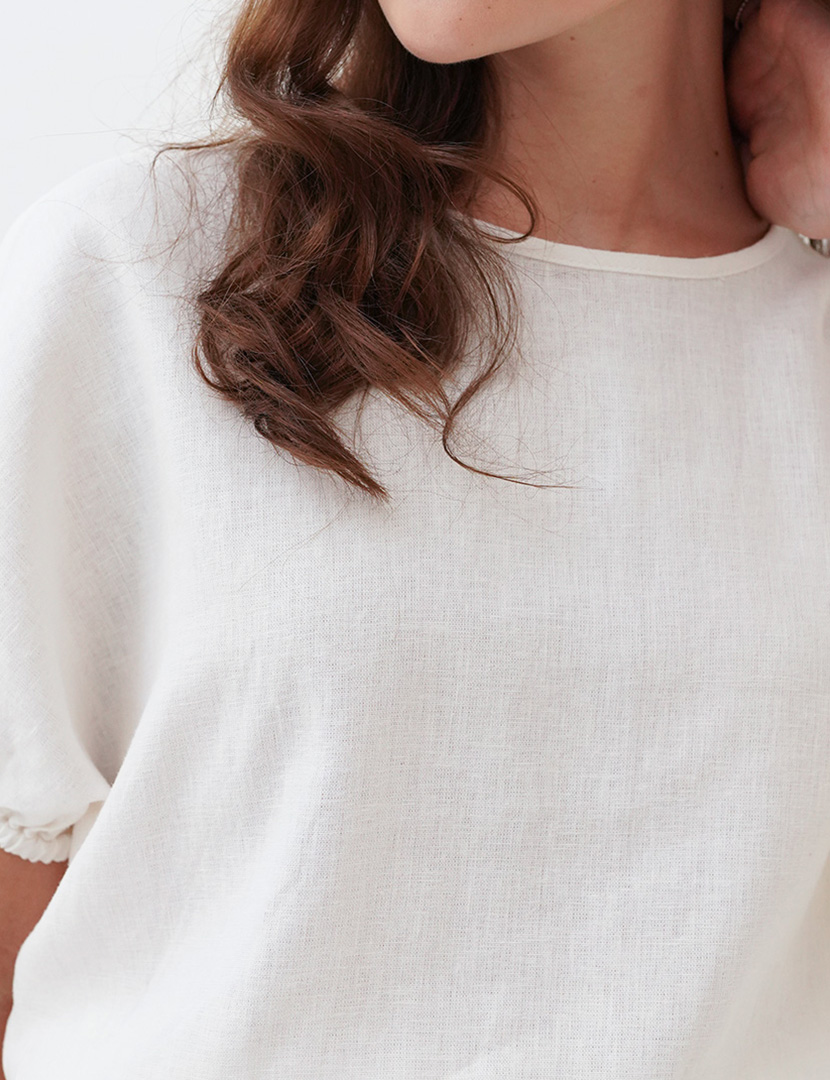 Cropped top made of linen fabric. Featuring short sleeves with elastic hem and a button opening at the back.