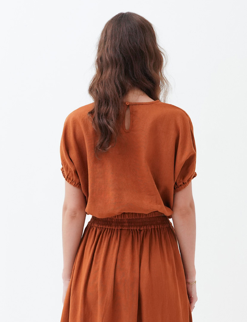 Cropped top made of linen fabric. Featuring short sleeves with elastic hem and a button opening at the back.