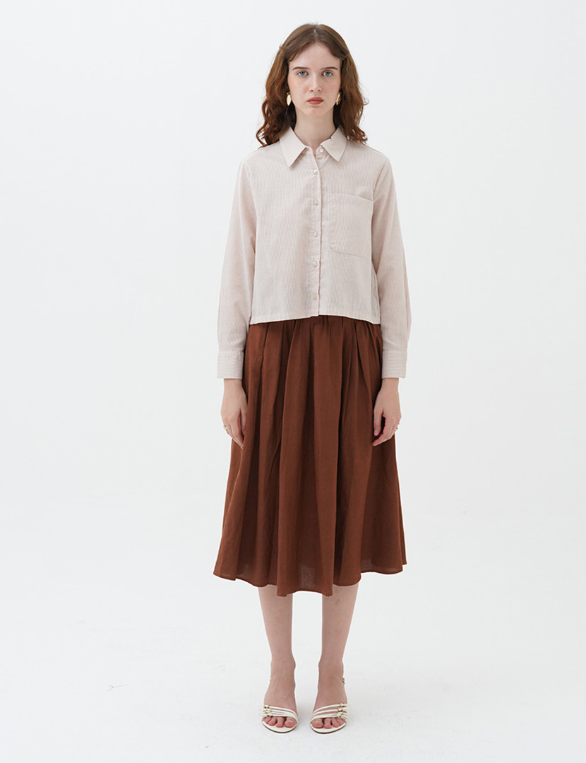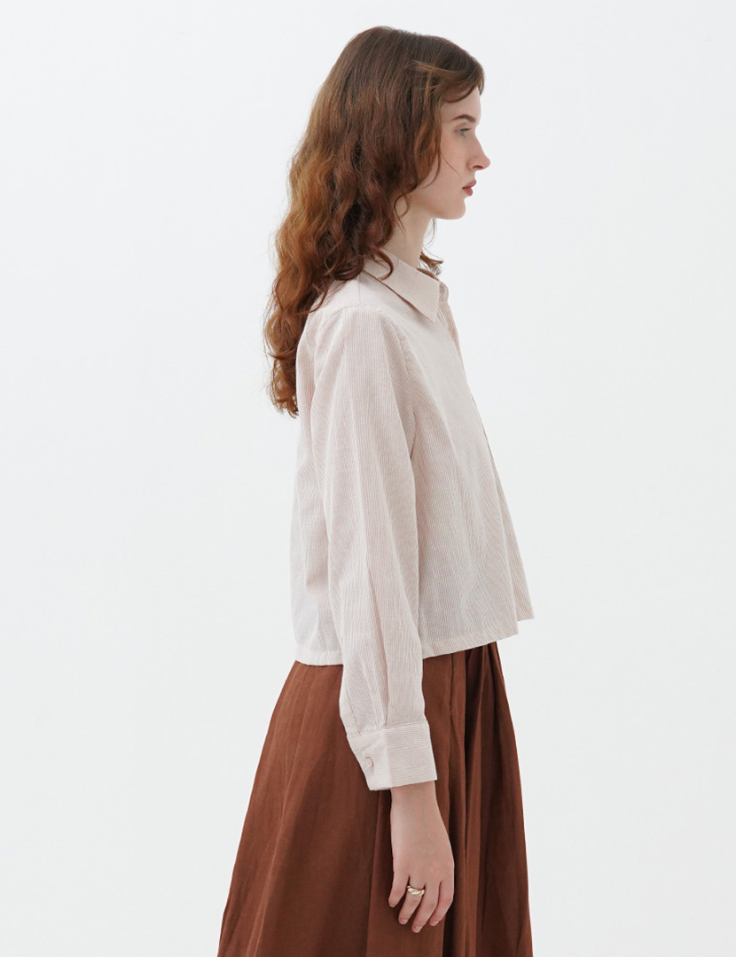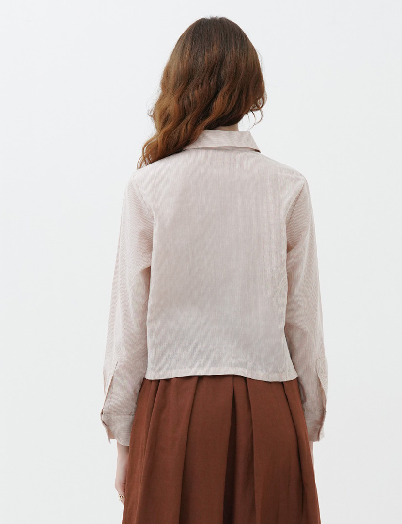 Cropped collared shirt with long sleeves, button up front with stripes fabric.