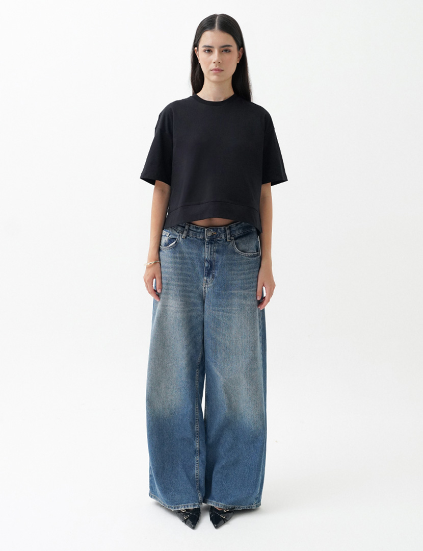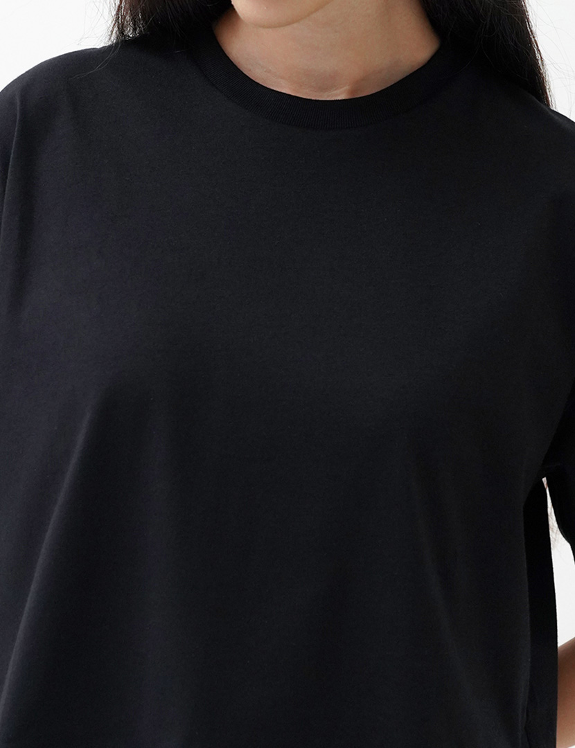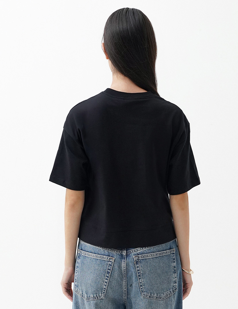 Cropped T-shirt made of spun cotton, featuring a round neck and short sleeves, side vents at the hem.