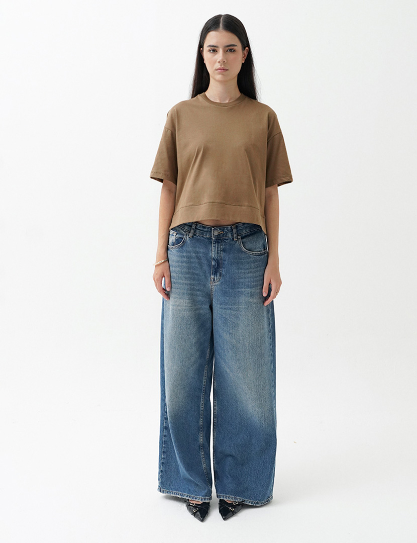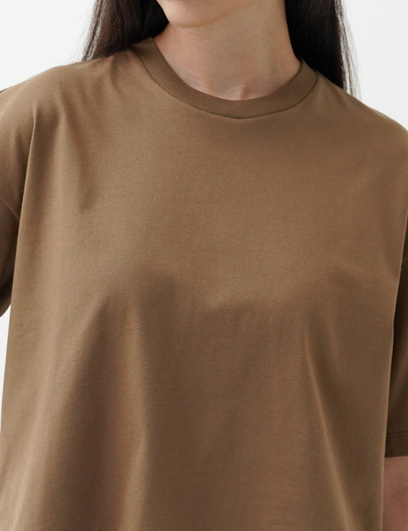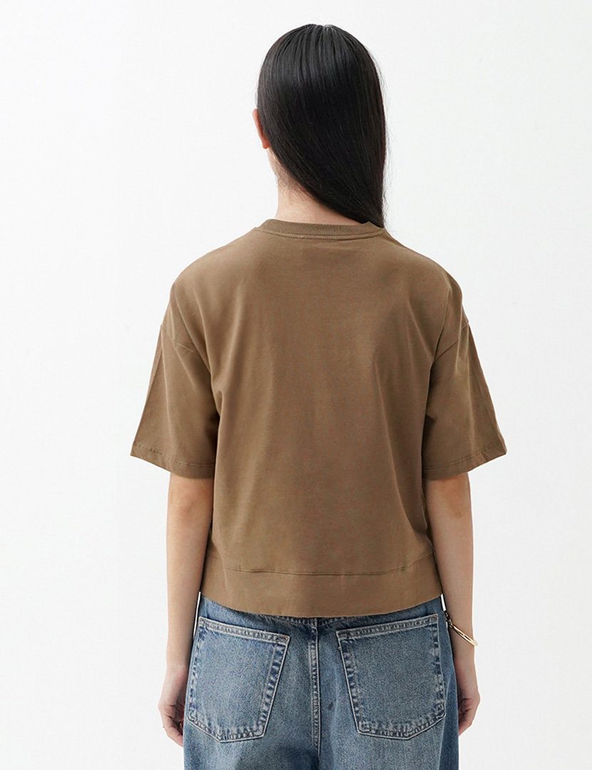 Cropped T-shirt made of spun cotton, featuring a round neck and short sleeves, side vents at the hem.