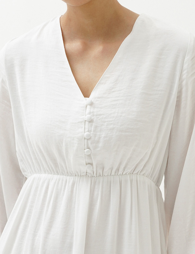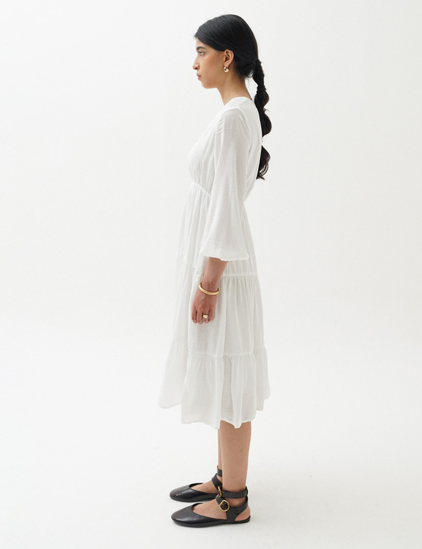 Flared midi dress in breathable fabric with gently puffed sleeves and a tiered, flowing skirt.