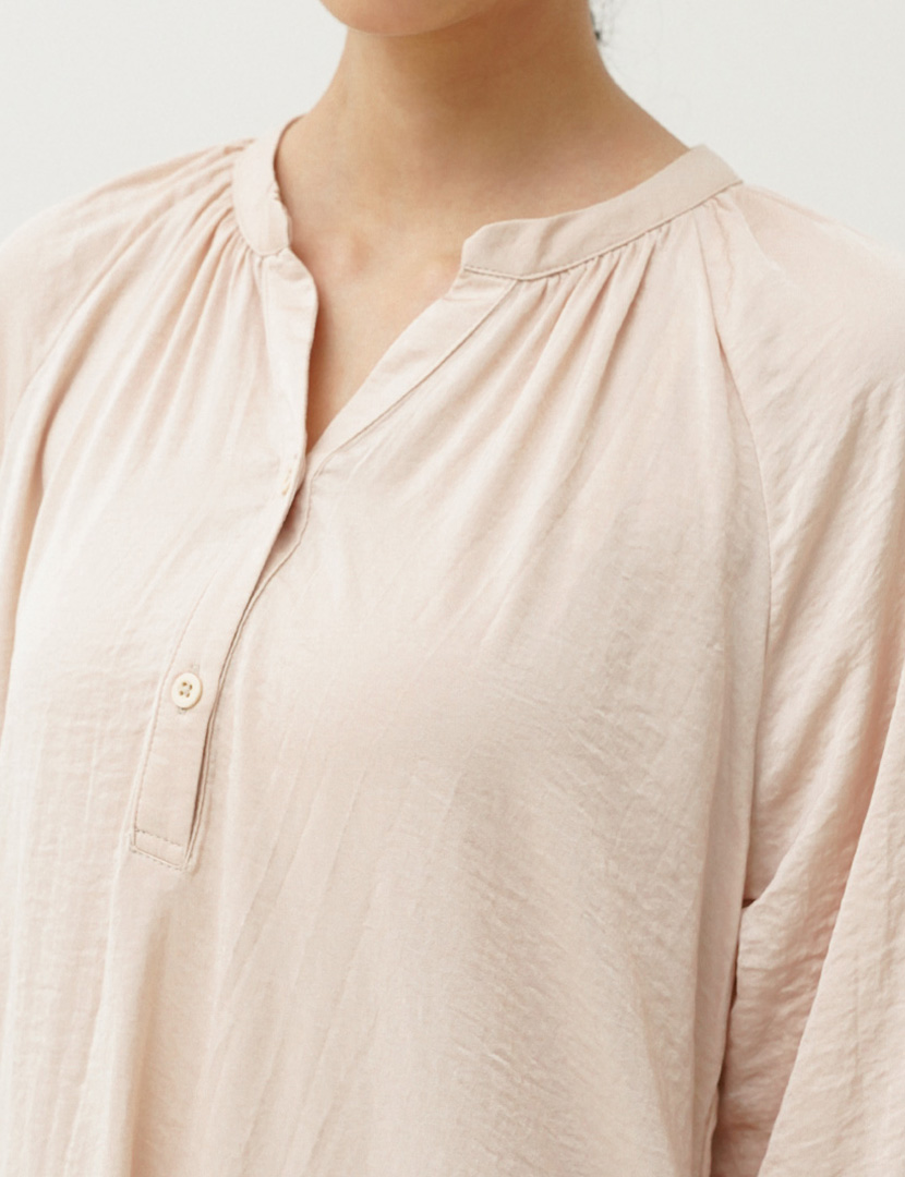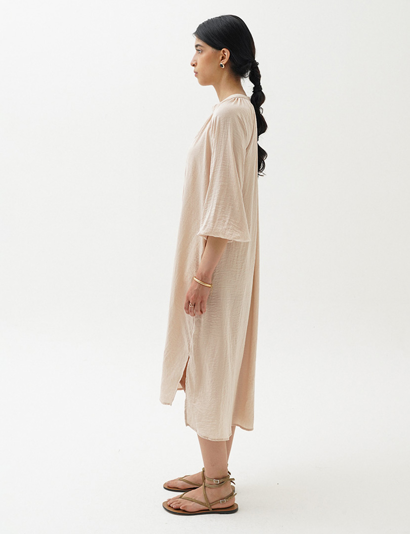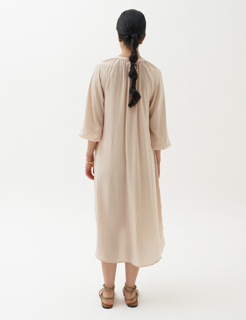 Midi flowy dress with a shanghai collar and long sleeves with buttoned cuffs. button-up front.