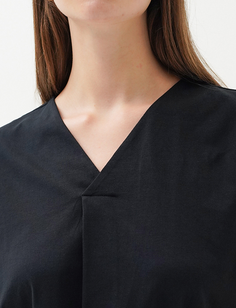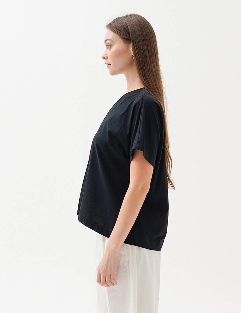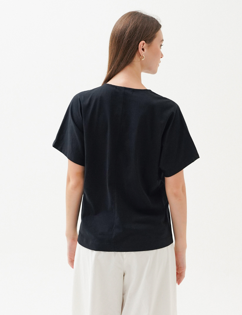 T-shirt with a V neck and drop short sleeves. Straight hem &