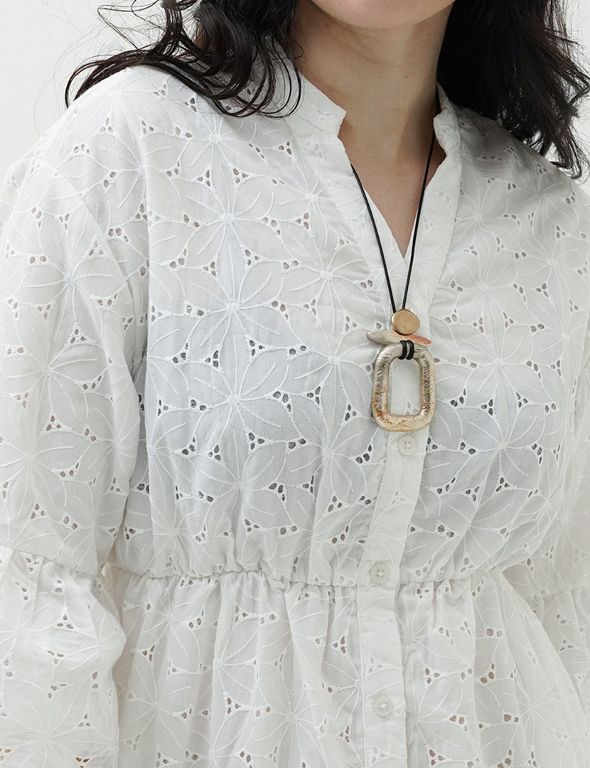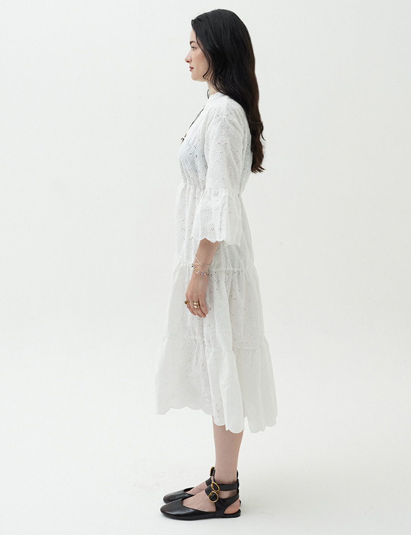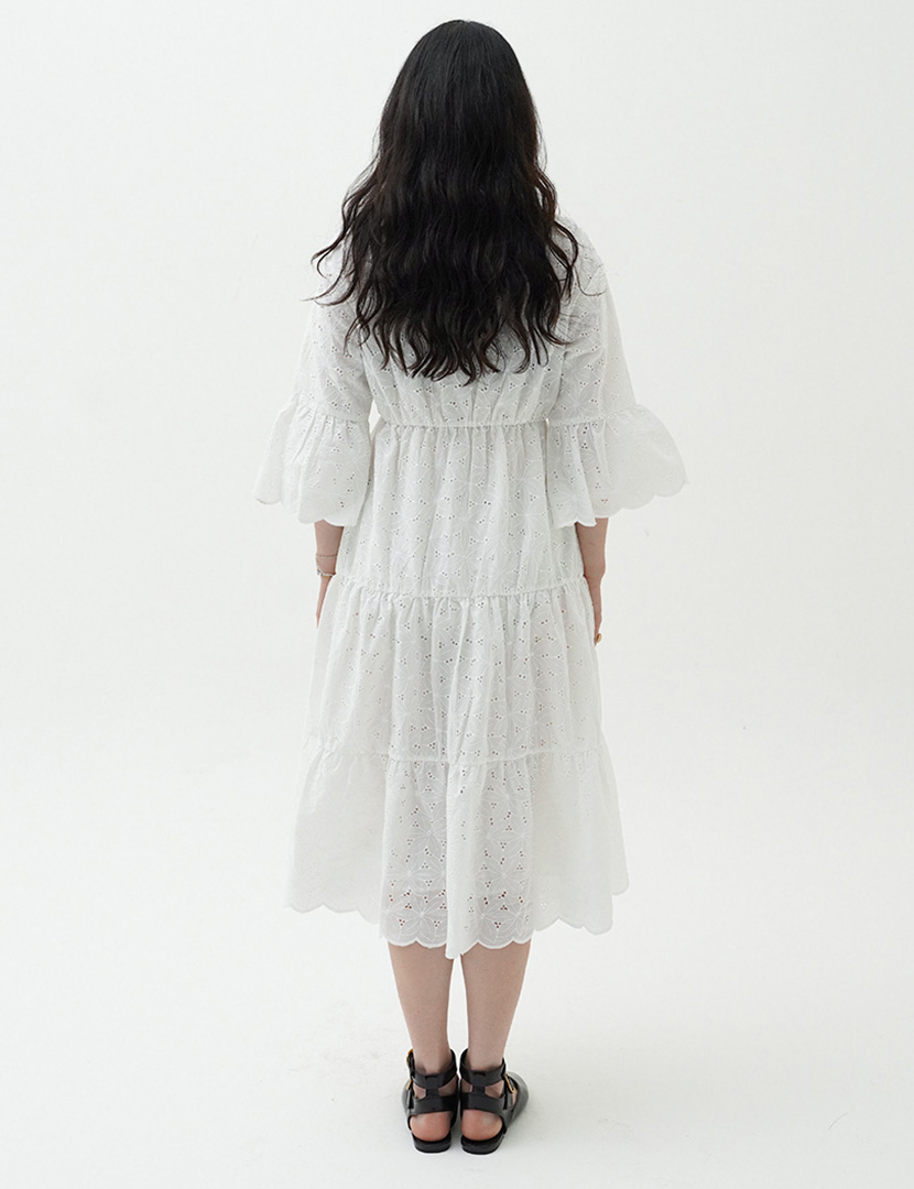 Eyelet Embroidery dress with flare sleeve and scallop details.