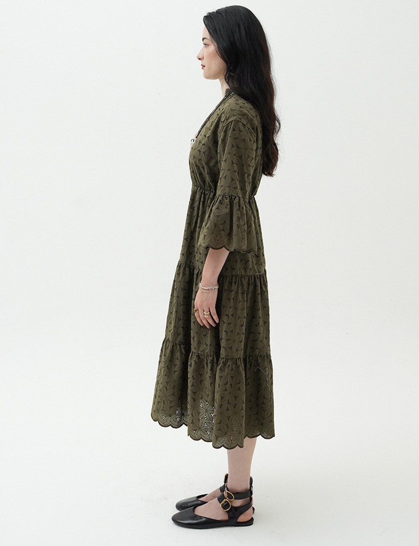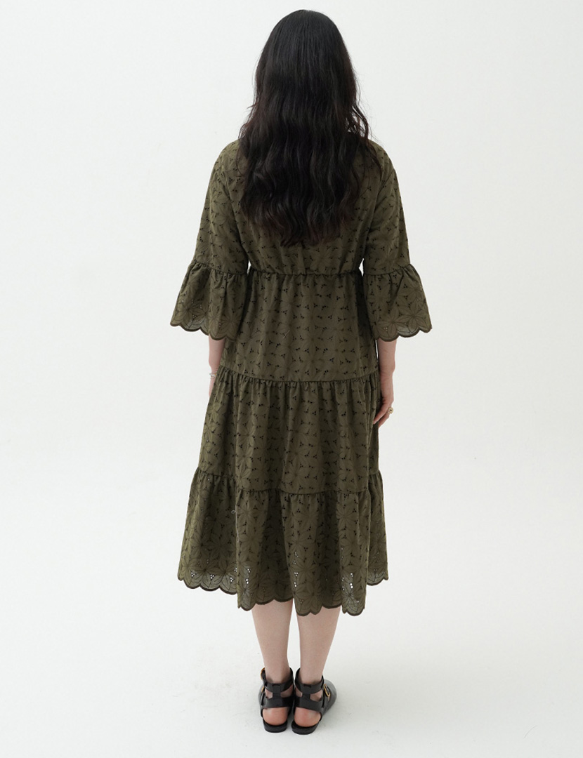 Eyelet Embroidery dress with flare sleeve and scallop details.