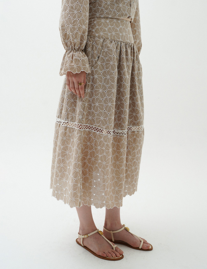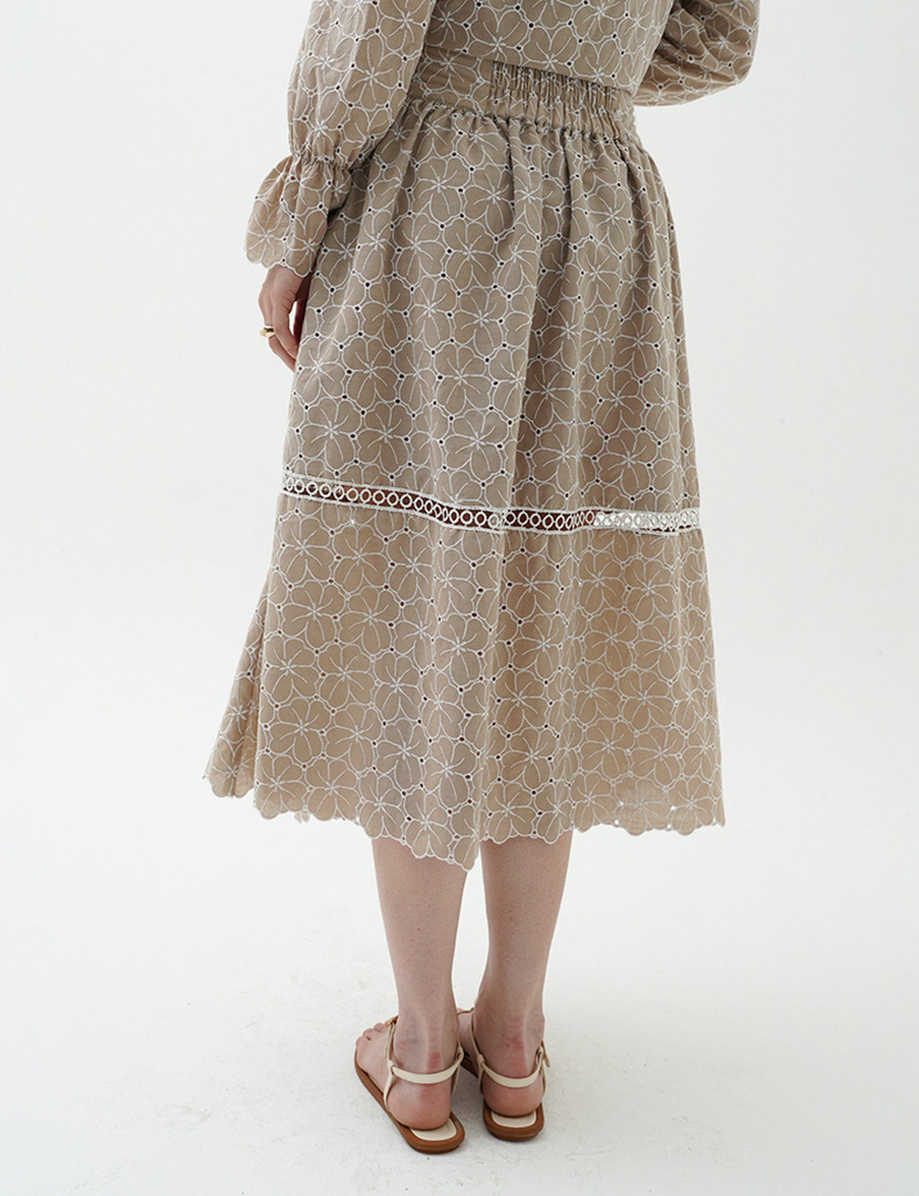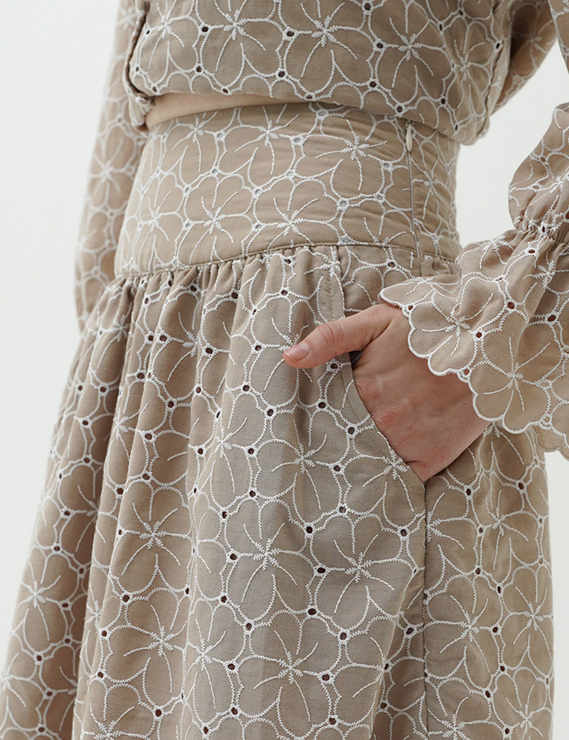 Skirt in breathable fabric, with a-line silhouette and scalloped edges details, hidden side zipper closure.