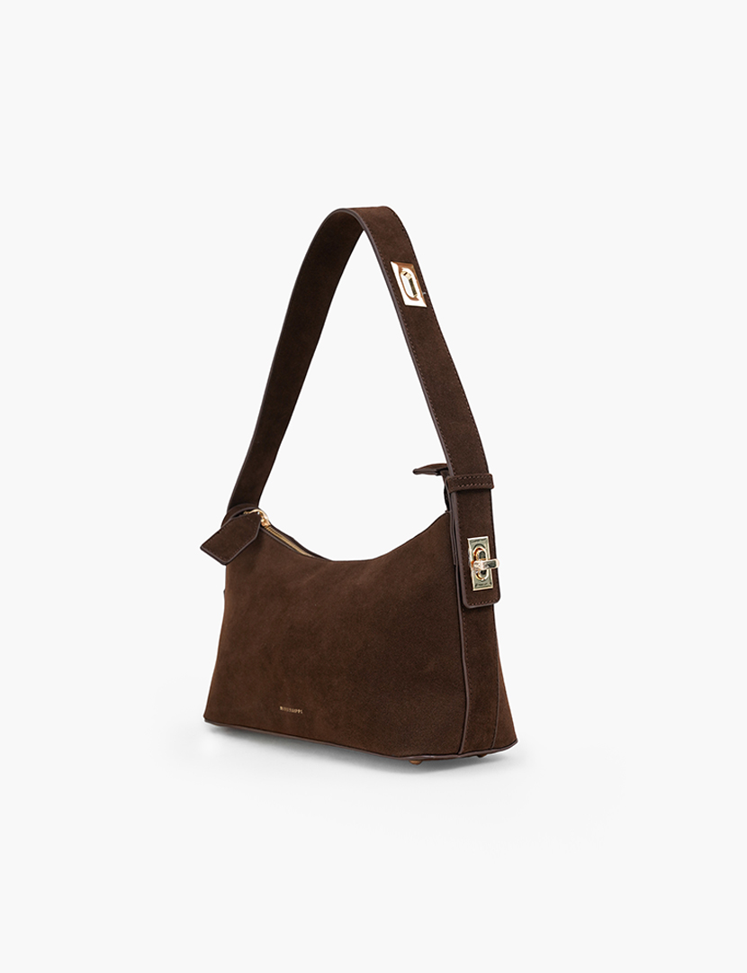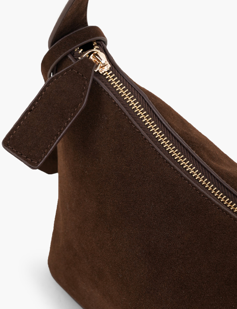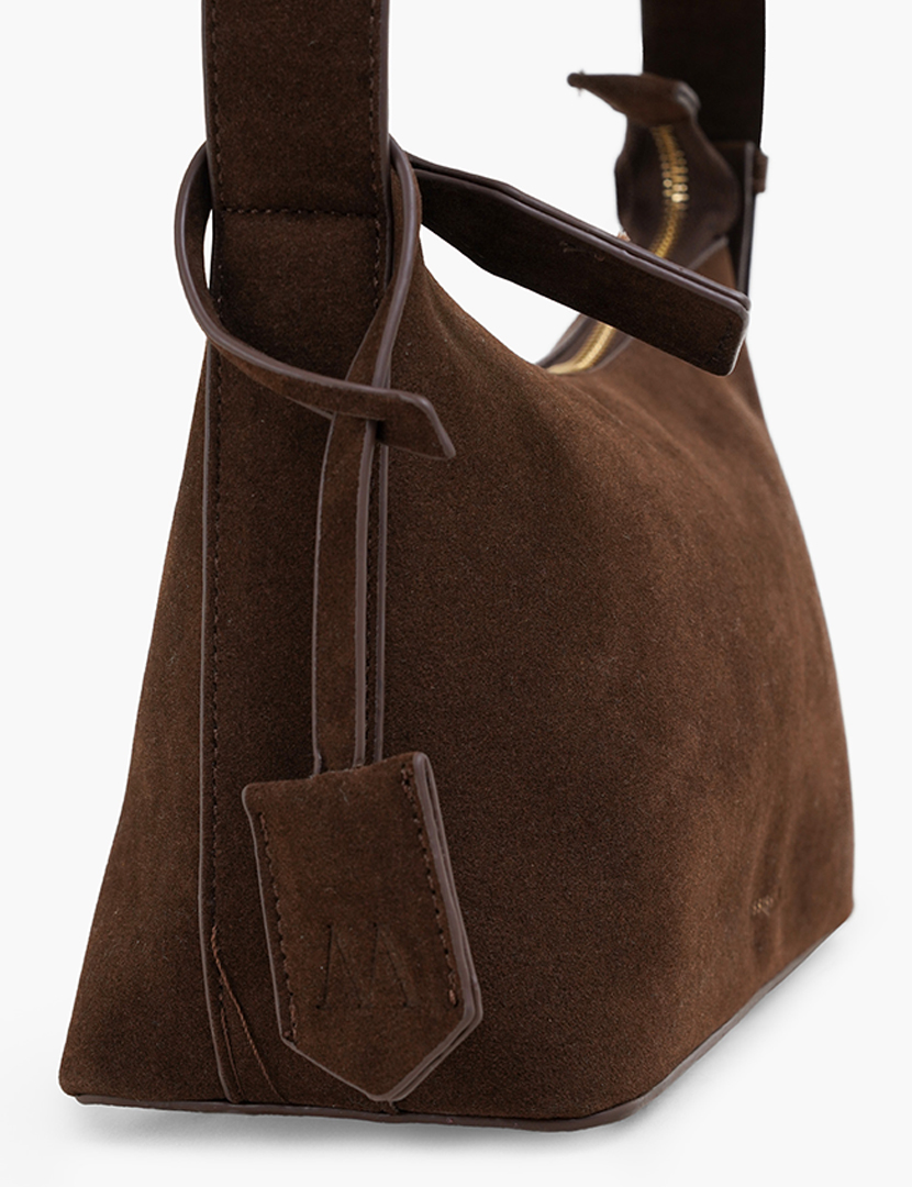 A suede hobo bag with adjustable straps that has 2 clips. Interior zip pocket. Zip closure.