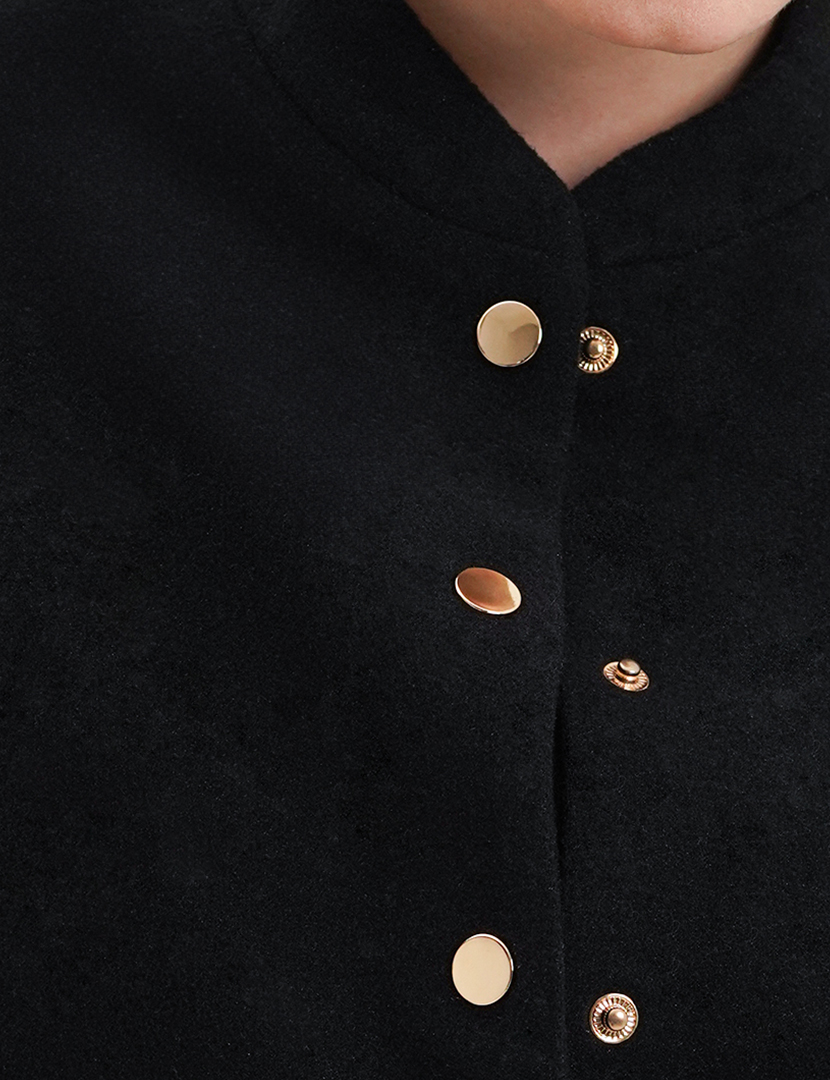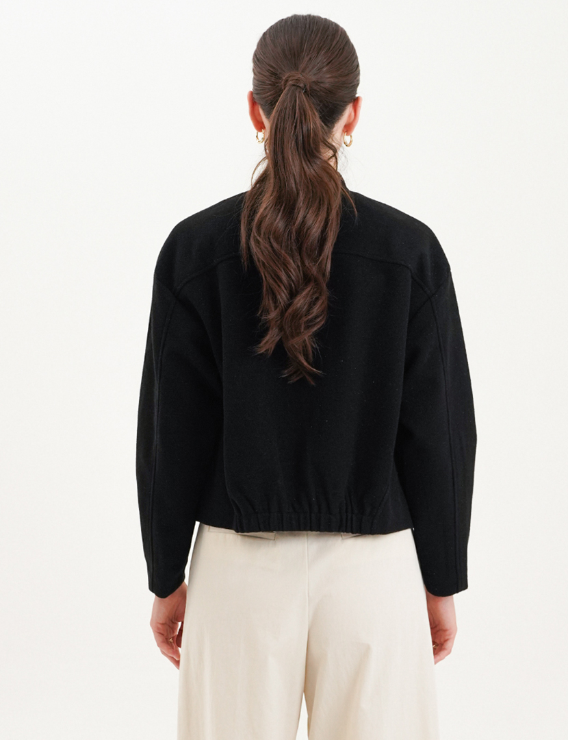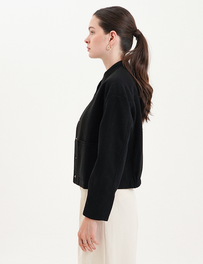 Bomber-style jacket with a round neck and long sleeves. Featuring Front patch pockets and Button fastening at the front.