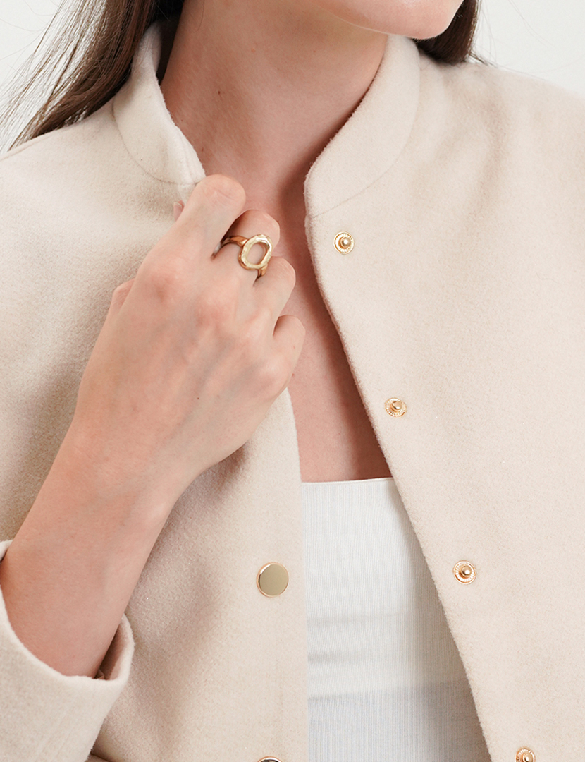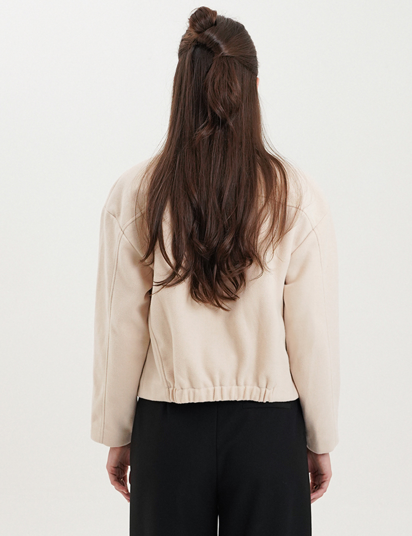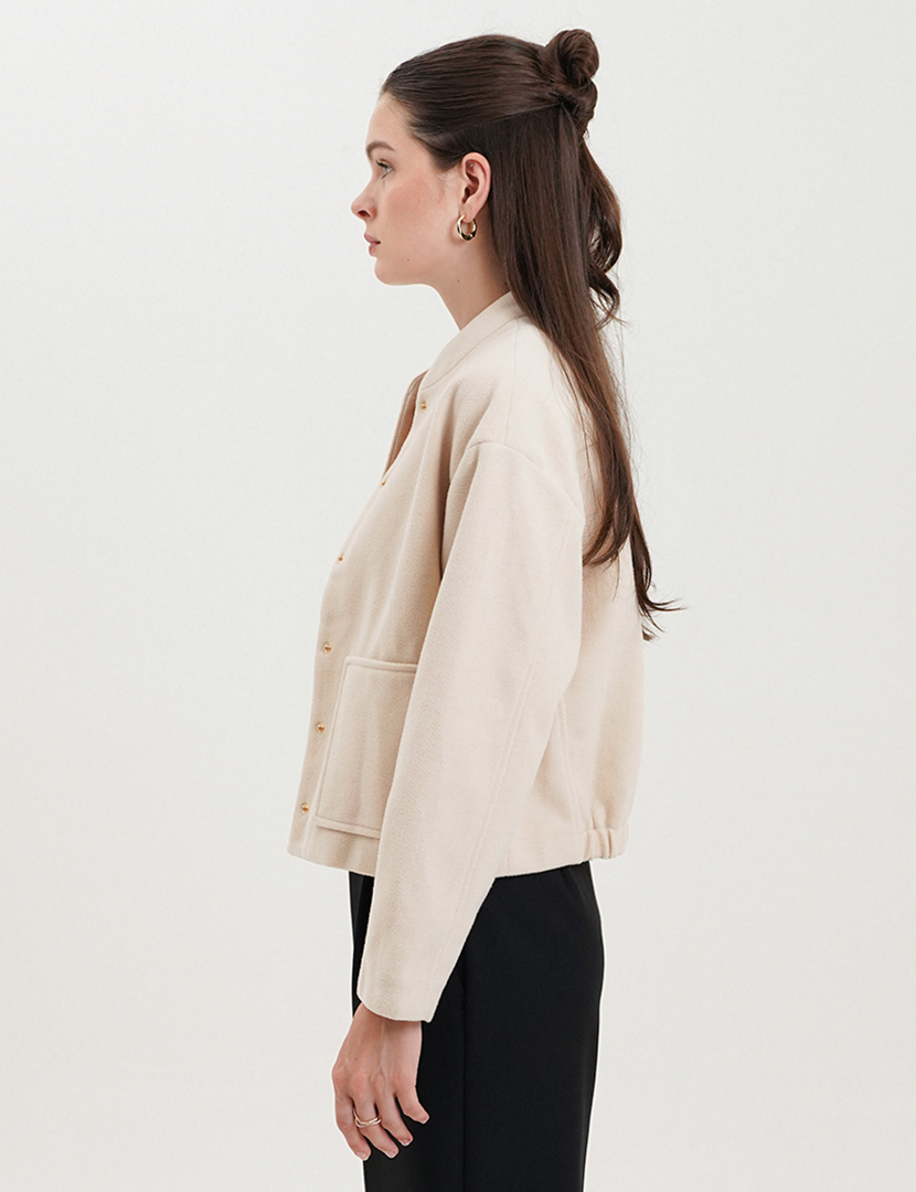Bomber-style jacket with a round neck and long sleeves. Featuring Front patch pockets and Button fastening at the front.