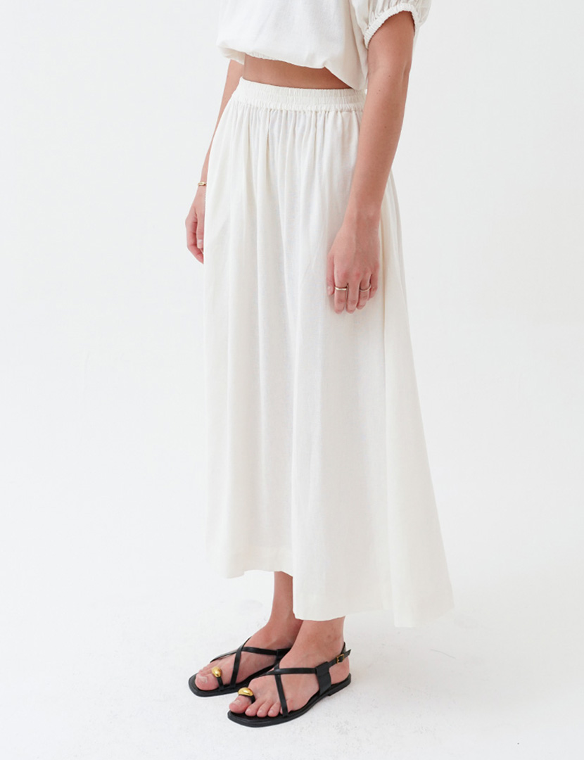 High-waist midi skirt made of cotton linen. Featuring an elasticated waistband and a voluminous hem.