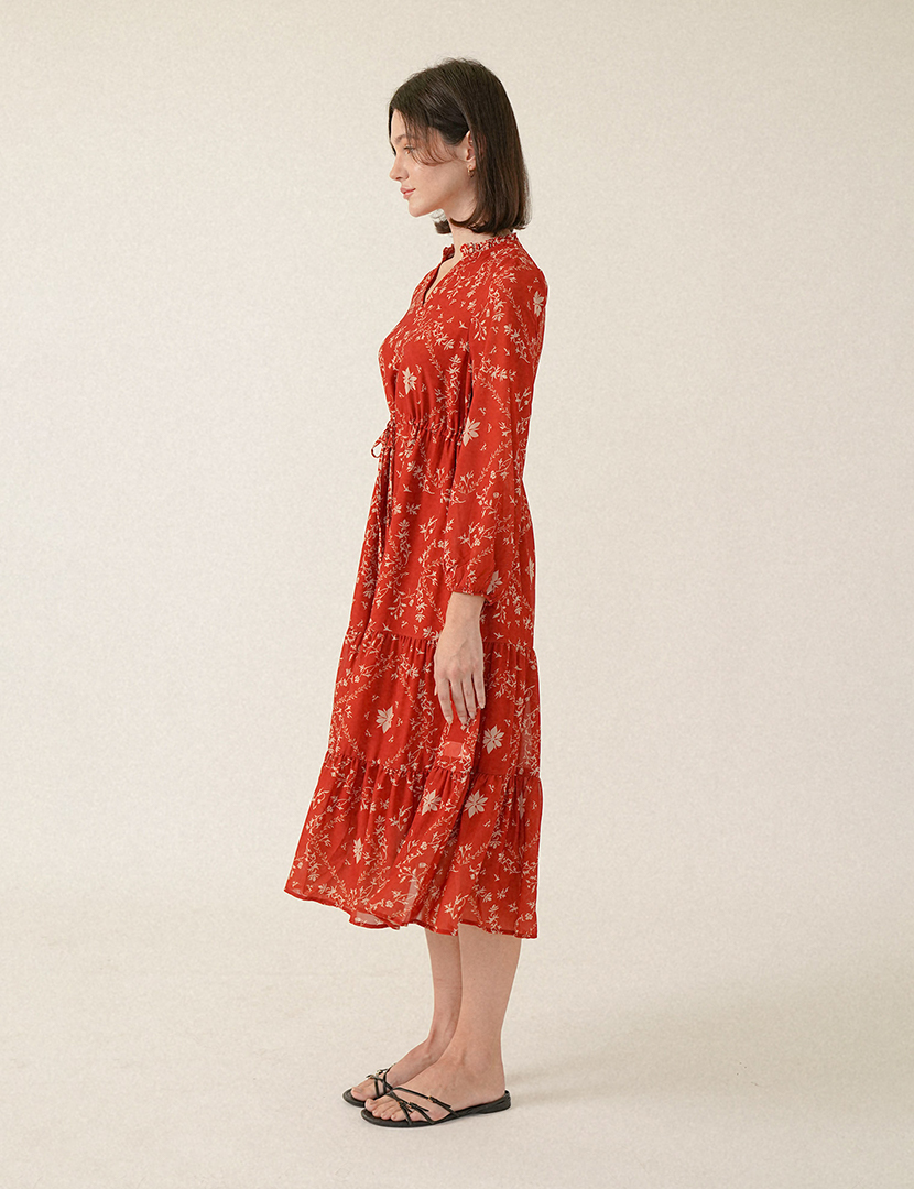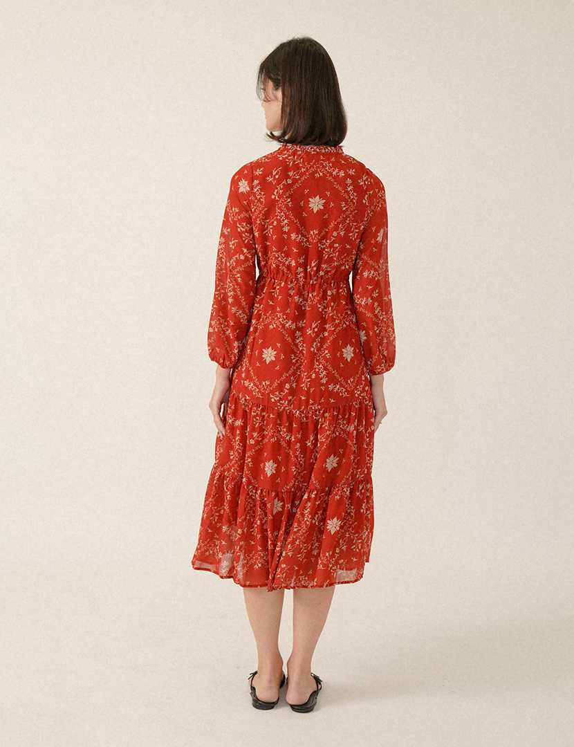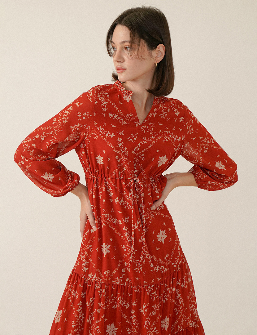 Sheer printed midi dress with a slot collar, long sleeves and drawstring waist, ruffled hem.