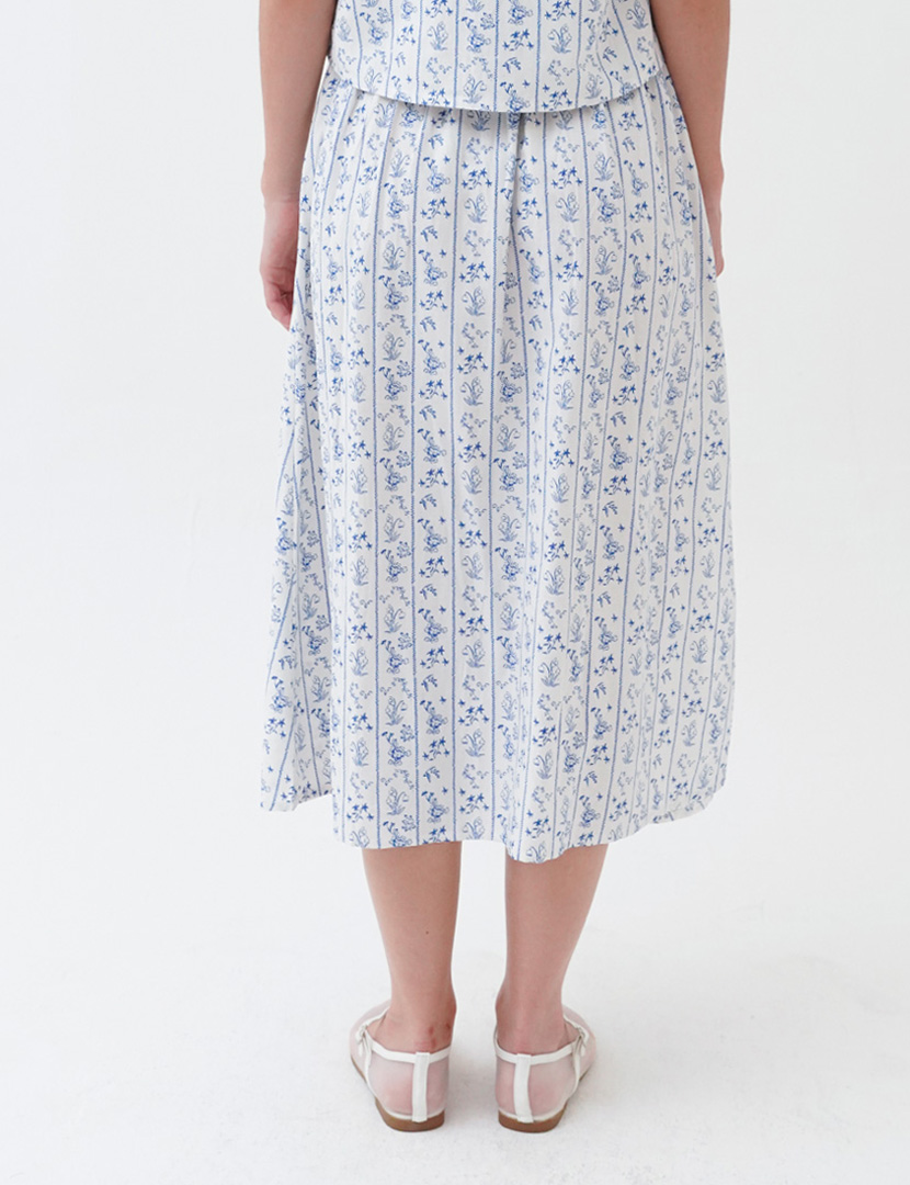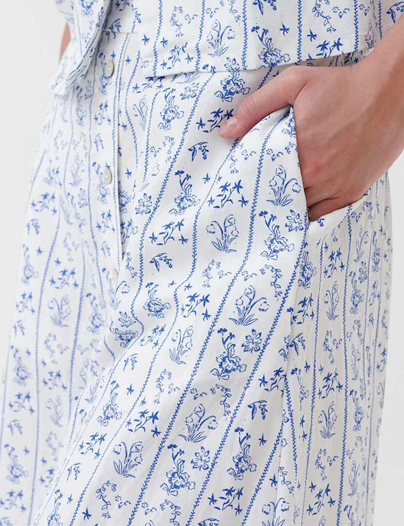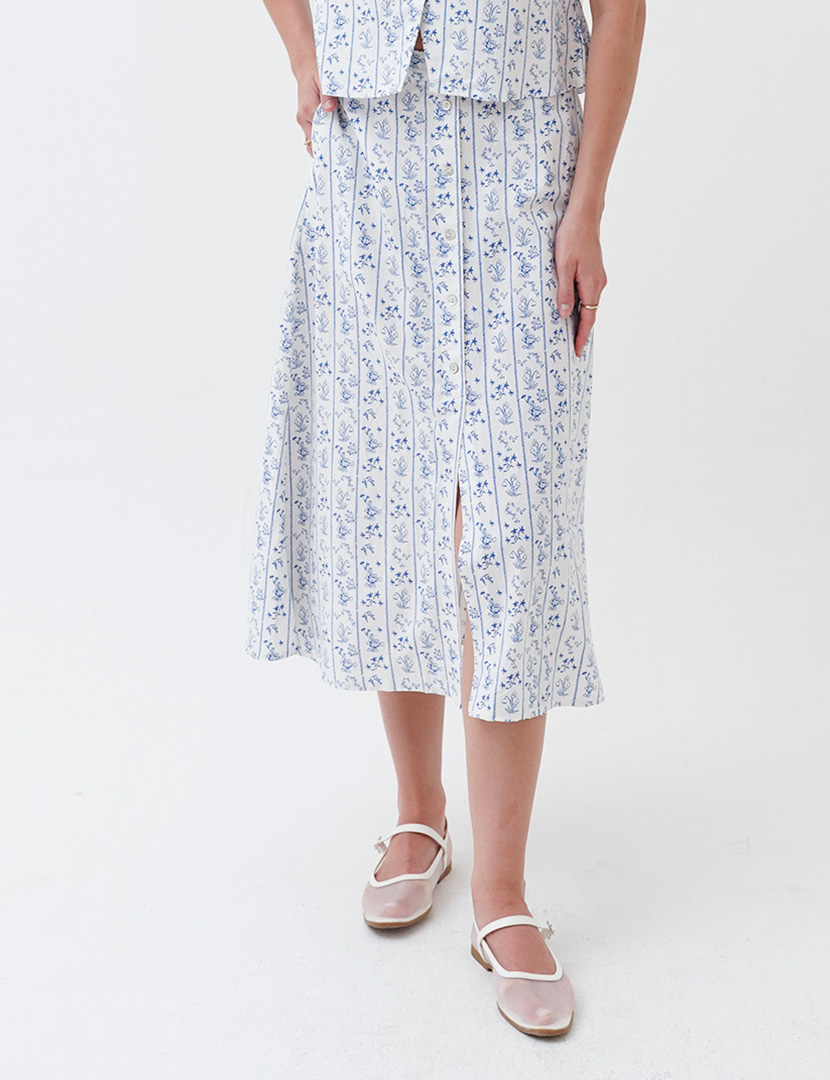 Midi skirt with floral print and front slit. A-line silhouette. Hidden in-seam zip closure.