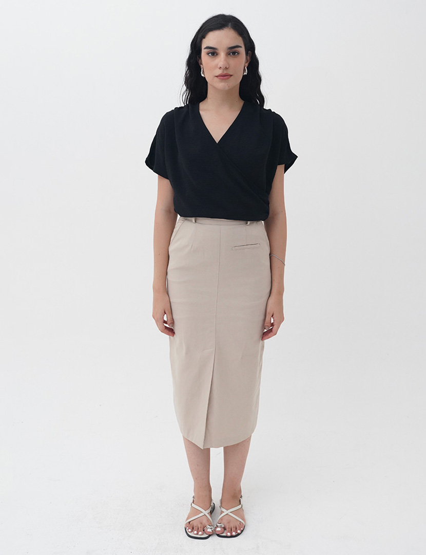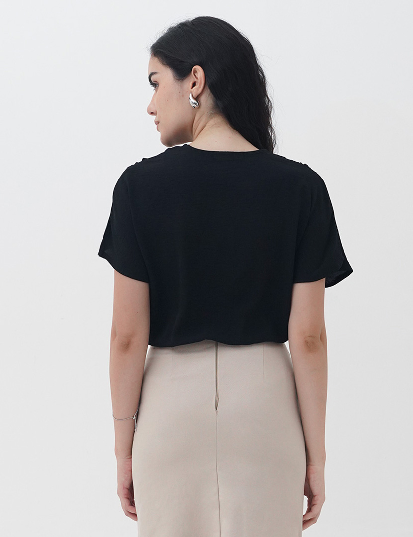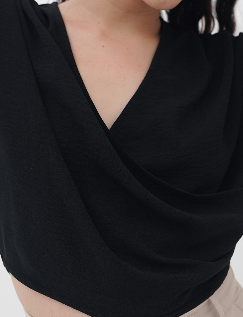 Flowing top with a surplice neckline and short sleeves, side pleats.