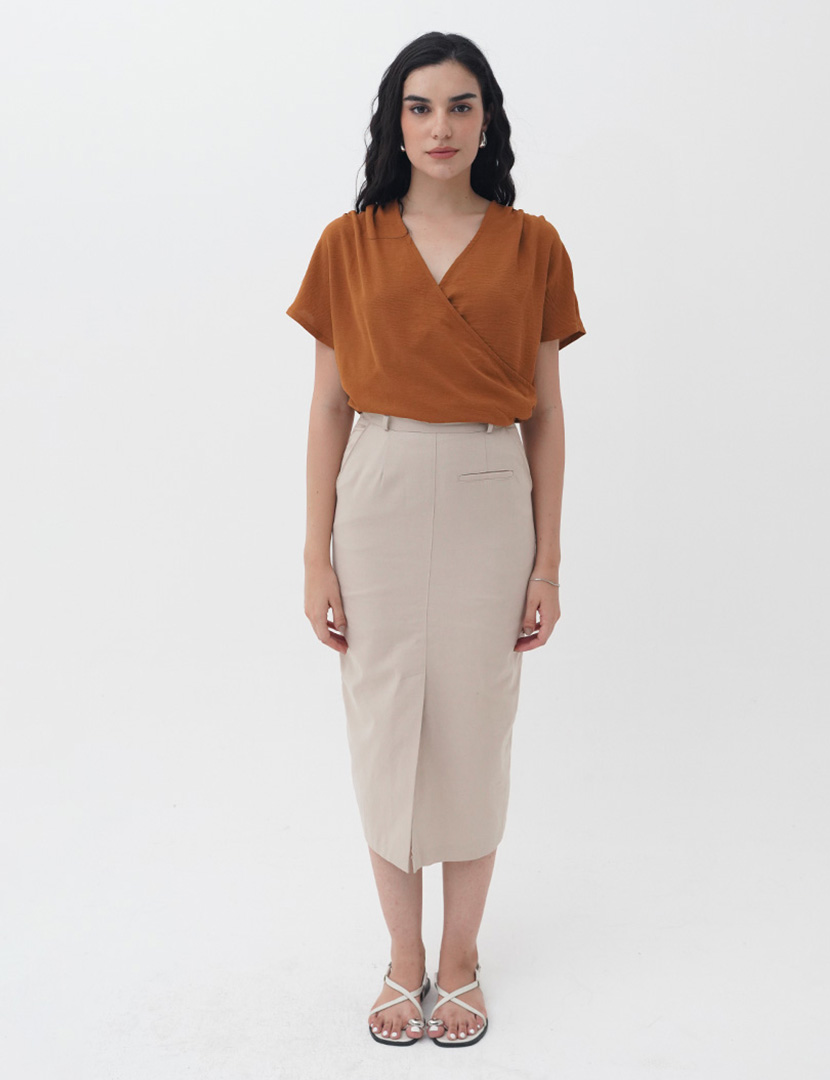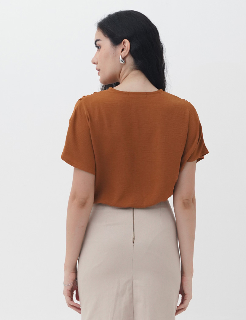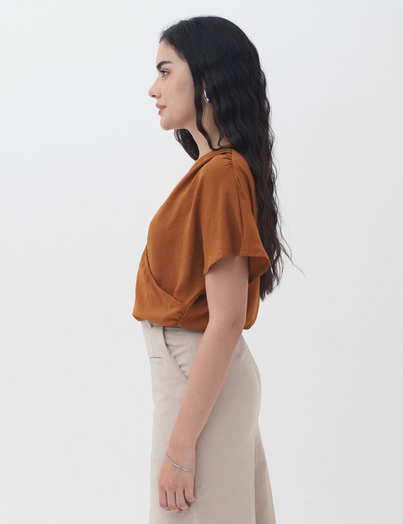 Flowing top with a surplice neckline and short sleeves, side pleats.