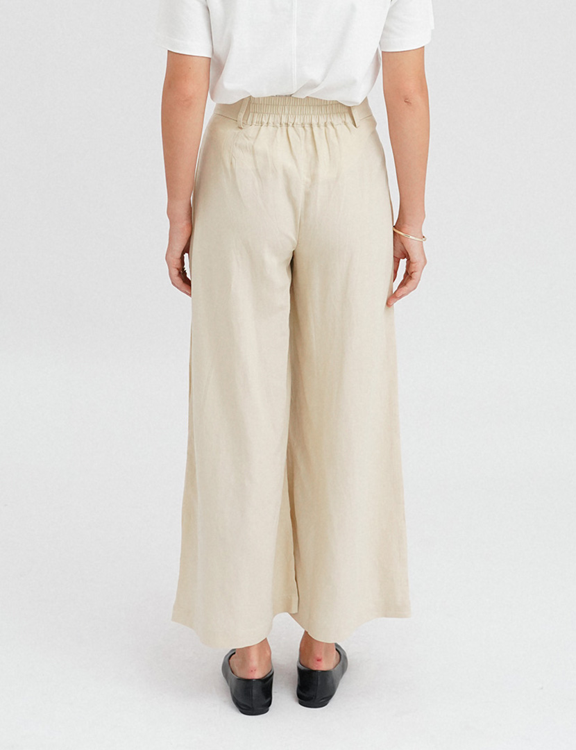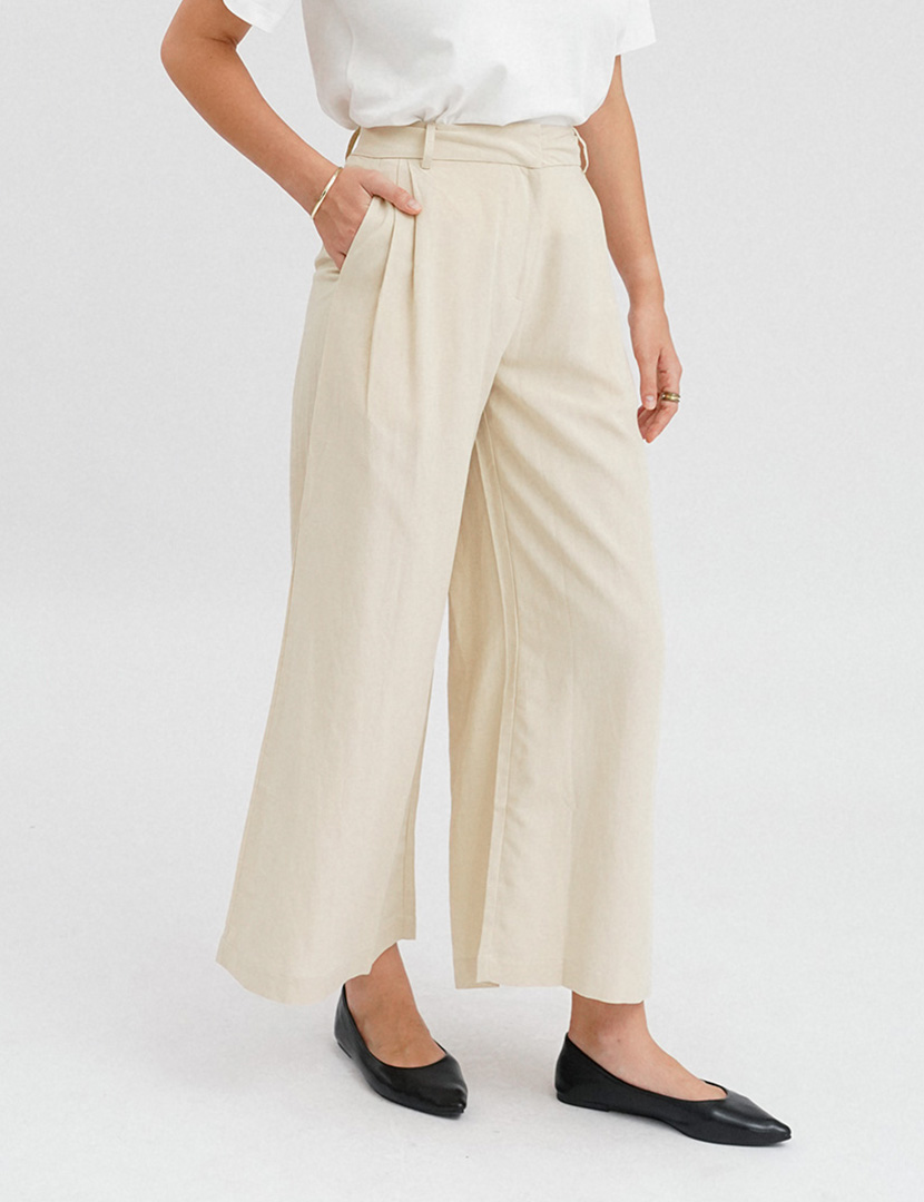 High-waist trousers with front pockets, double pleated details, front zip fly and metal hook fastening.