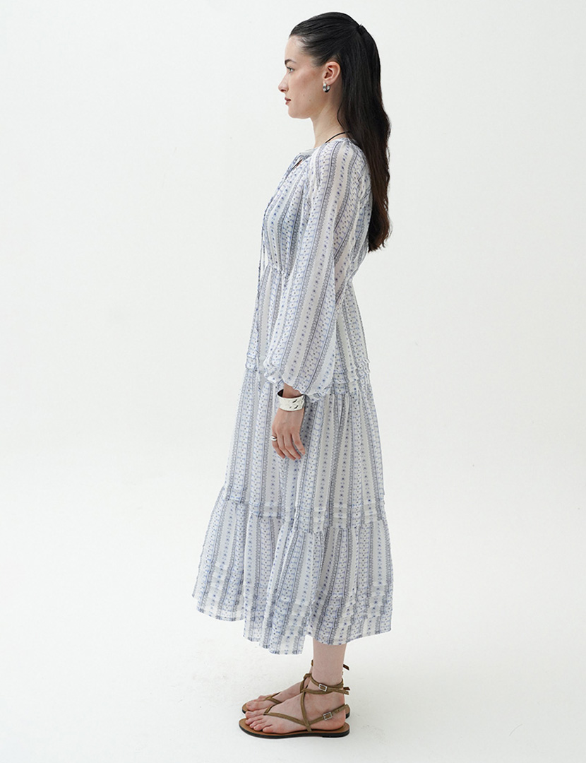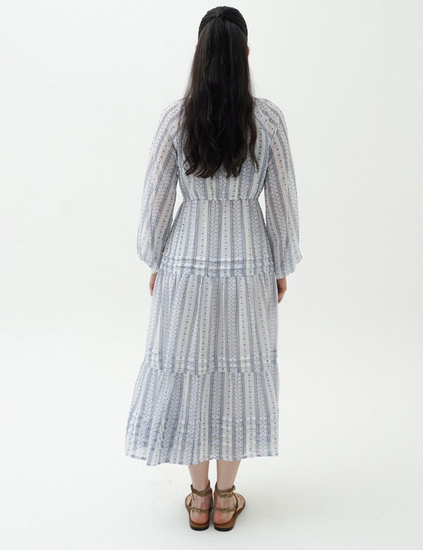 V- neck dress with long puff sleeves. Flare skirt silhouette with layered gathered and pleated details on the skirt.
