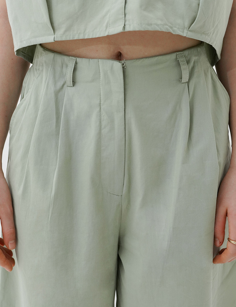 High-rise trousers featuring an elastic waist, side pockets and pleats on the front, straight-leg design, front zip fly.