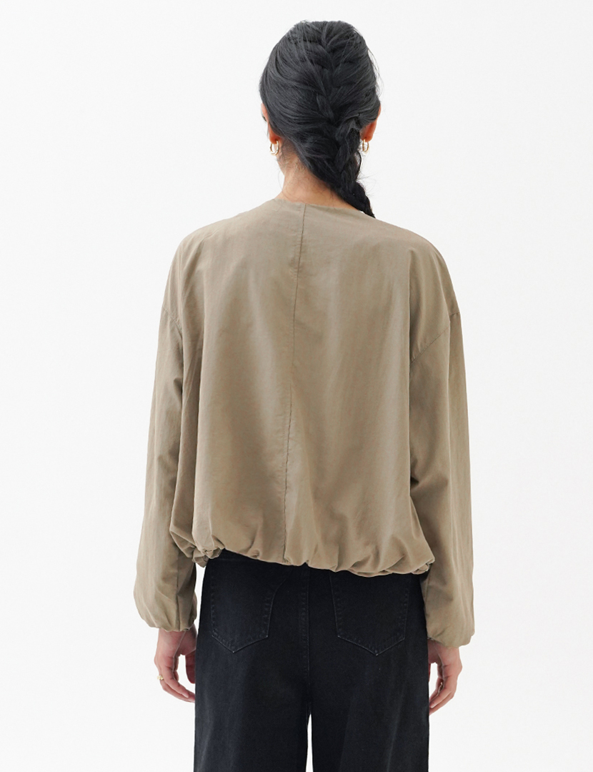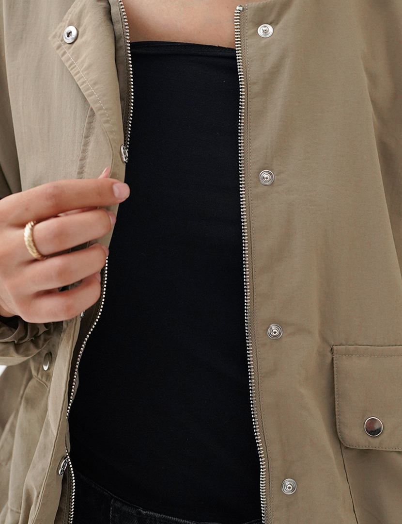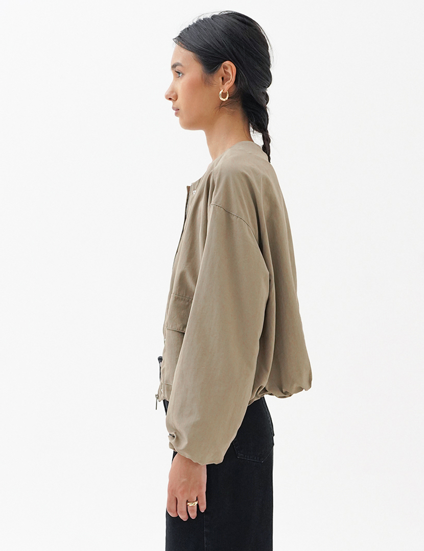 Jacket featuring a round neck and long sleeves with inner elasticated cuffs. Featuring front patch pockets, side pockets, an inner elasticated hem and a zip-up front.t hidden by a snap-button placket.